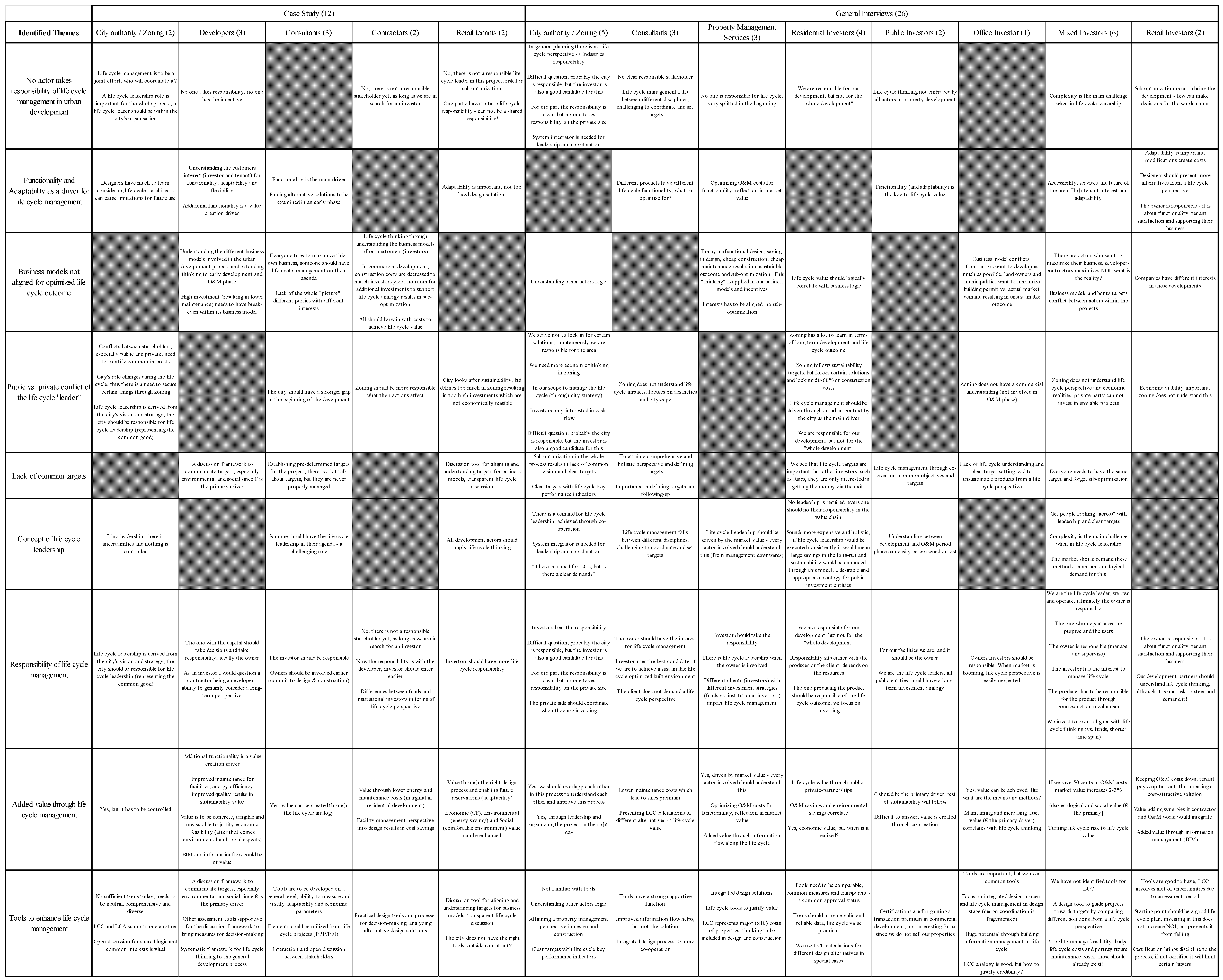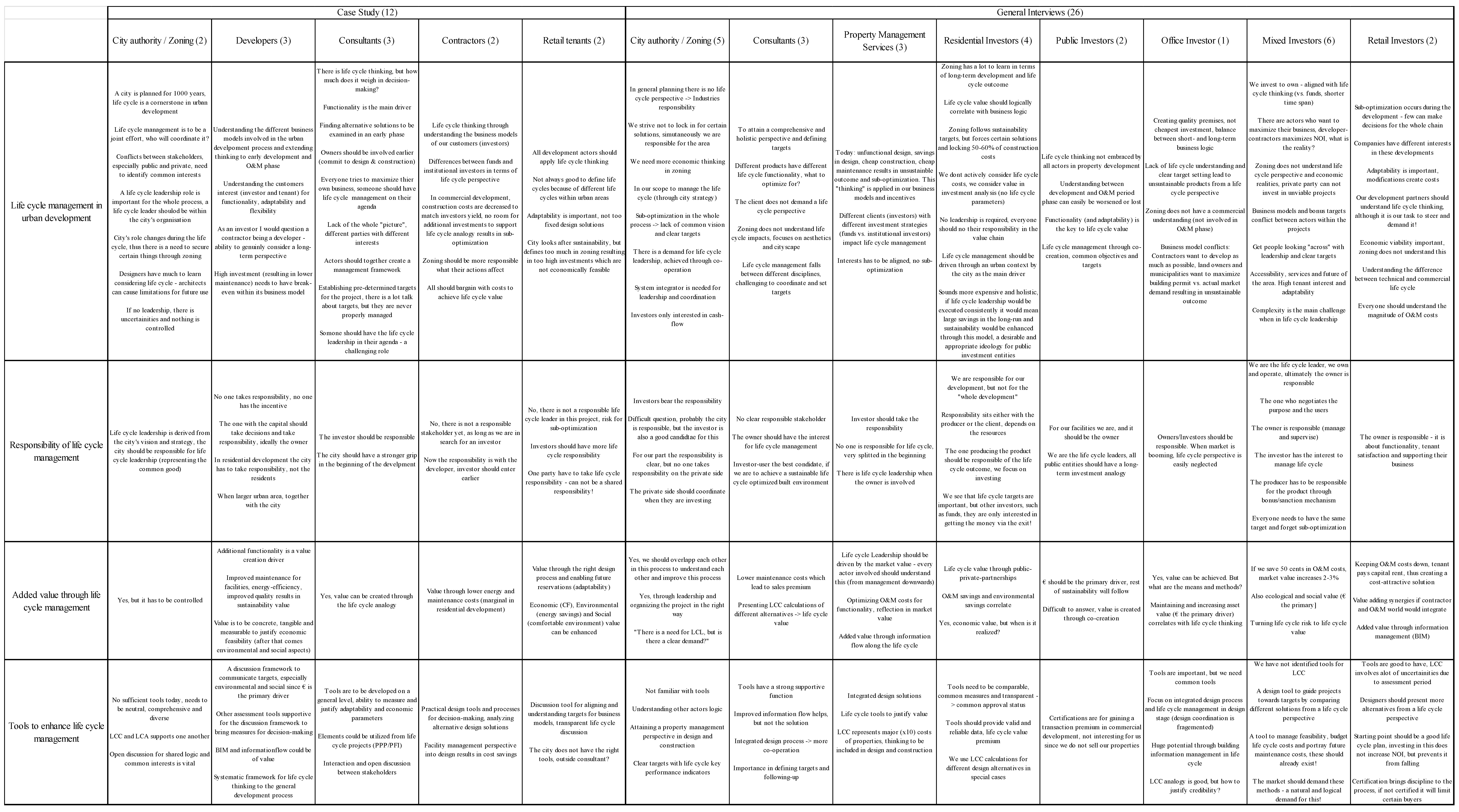 The actors analyzed across each other in this study were public authorities, private actors (consultants, developers, contractors, retail tenants, property managers) and different kinds of property investors (residential, public, office, mixed, retail).