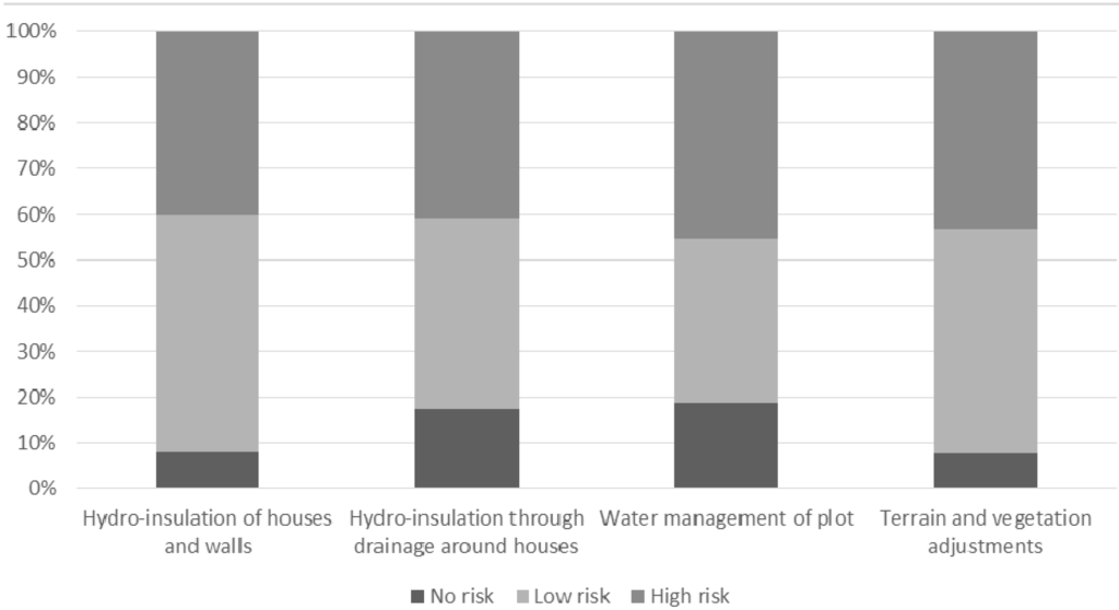 40] have conducted, for example, an economically-focused study in the Netherlands, in which they determined respondents’ willingness to pay for flood insurance in comparison with their willingness to pay for measures to reduce the flood risk in the form of constructing a raised ground floor to their house. The results demonstrated that approximately 52% of respondents gave priority to a raised ground floor, thereby wishing to actually resolve the problem rather than merely paying for insurance. The authors argue that approach is influenced by previous experience of affected population in the Netherlands where the number of flood events has increased markedly, and people are aware of the risks to a greater extent. It should be stated, however, that only “willingness” was investigated and not actual measures.