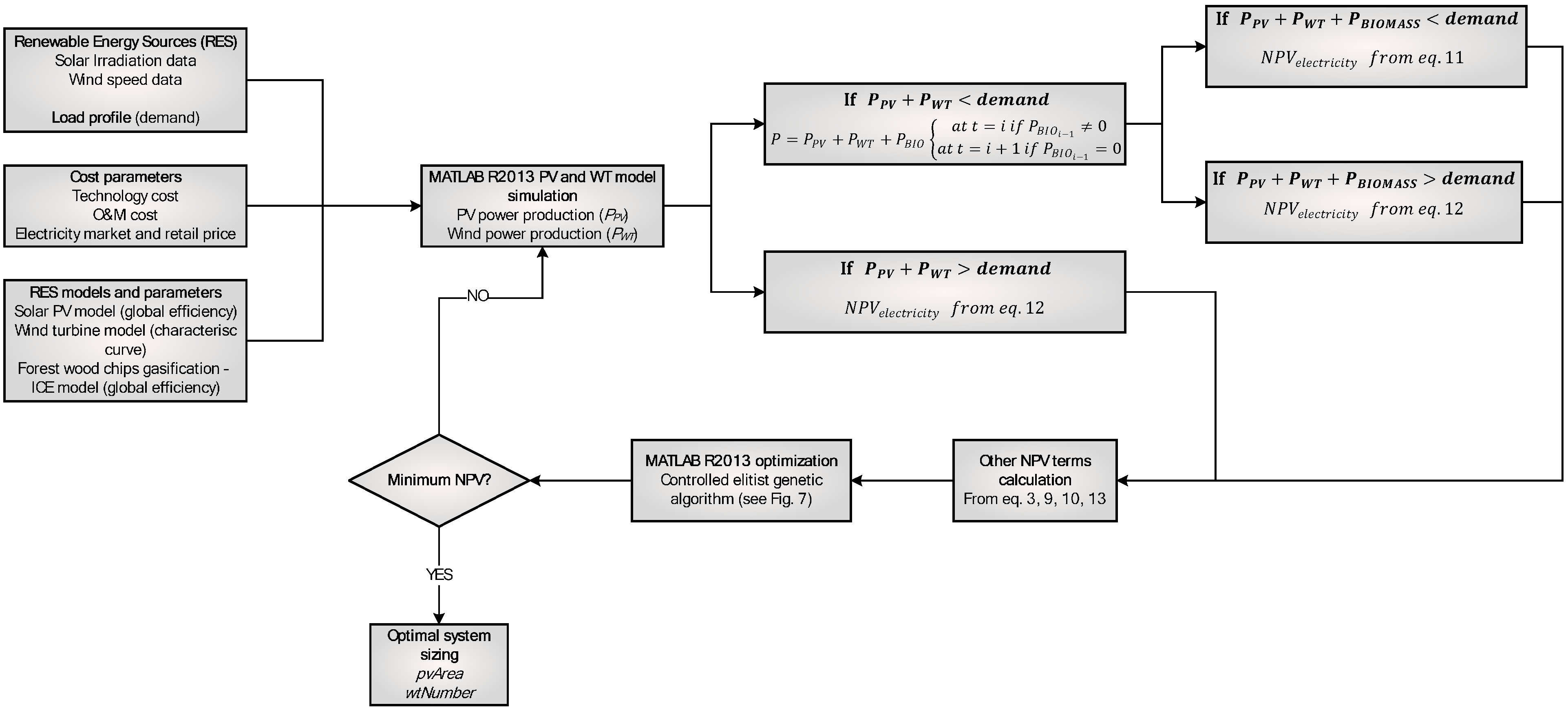 Hence, this paper presents a novel and innovative optimization methodology that could help to inform and improve PV–wind–biomass grid-connected HRES design, according to a minimum cost criterion. Such optimization is performed by means of a genetic algorithm-based model, by applying an approach from a life-cycle perspective when addressing the system cost. From such a point of view, all costs and revenues throughout the lifetime of the system should be considered, that is, initial investment, expected incomes, and costs from electricity sale or purchase, operation, and maintenance costs, component replacement (if required) and component sale at the end of the lifetime [19,33]. Another aspect worth highlighting is the use of real data with an hourly accuracy, allowing the model to compute the hourly discrimination electricity tariffs and market price, as well as the daily and seasonal patterns of involved stochastic RESs, solar irradiation, and wind speed. Moreover, the inclusion of forest wood chips as biomass fuel has been made, considering environmental criteria, which is a novel perspective. For example, instead of considering that the biomass-based fuel is acquired at current market cost, the acquisition cost of fuel obtained from sustainable harvesting and processing practices has been considered. Such insight means a higher fuel cost compared with current market prices, but it helps in reducing the current mismanagement of Mediterranean forests, which leads to increased forest wildfires risk [27,34]. To compensate for such an economic handicap, the authors have also proposed a novel biomass unit pattern of operation, based on the maximization of unit efficiency by always working at full load and selling the excess of electricity, if any, to the grid. Such an operation pattern, not only increases the entire system efficiency, but also ensures that biomass is used in an optimum way so the scarce indigenously available resource is not wasted.