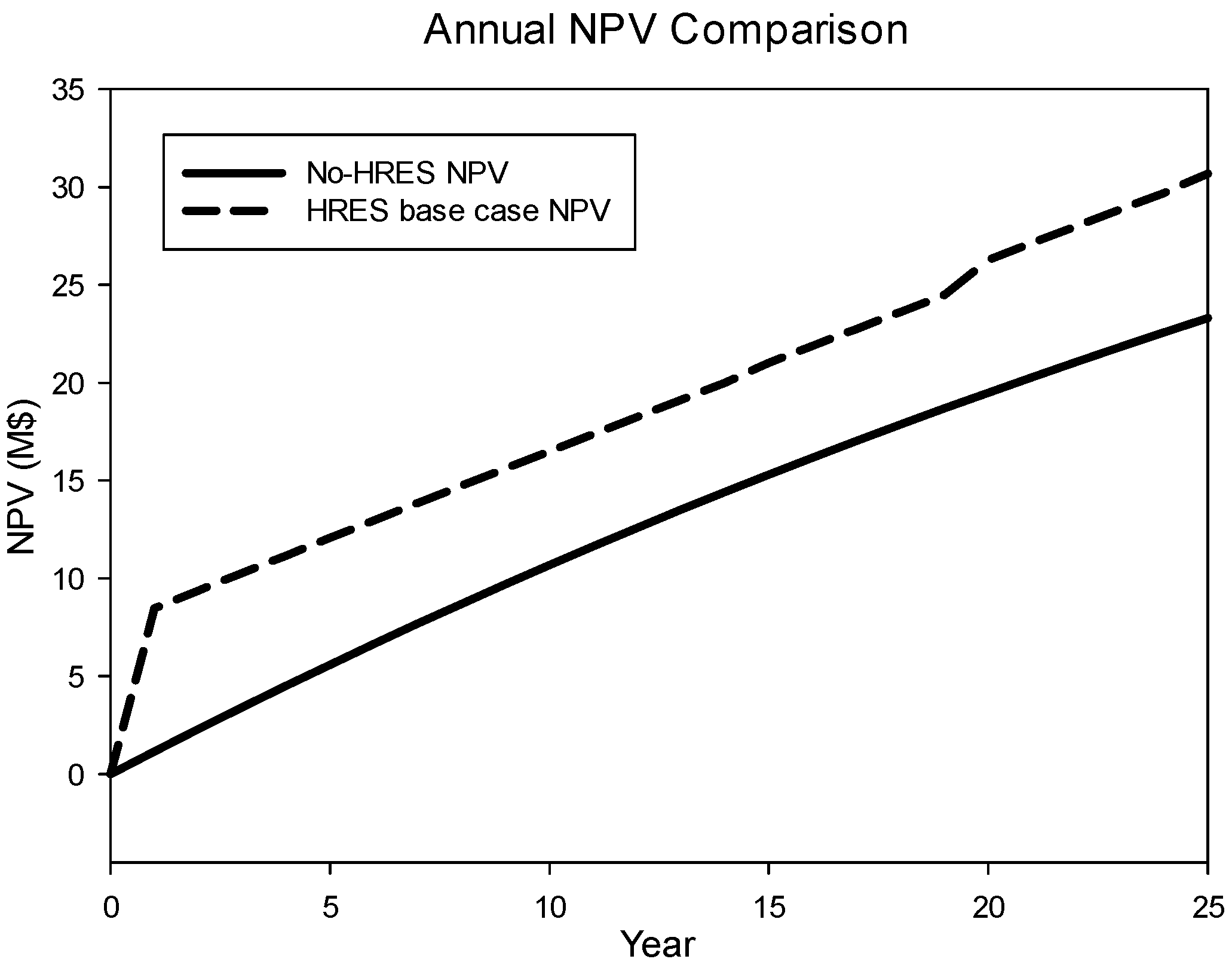 The results obtained for the proposed validation case show that a system consisting of 6044 m2 (994 kW) of PV power, three wind turbines (600 kW) of wind power, and 500 kW of biomass power with a yearly consumption of 1000–1050 metric tons would be the best option in terms of life-cycle cost. Such system would require an initial investment of 7.4 million US Dollars, and would suppose a 30.7 million US Dollar cost throughout its lifetime. From the comparison with the life time costs of electricity purchase from the utility company, it can be seen that the system would have similar annual costs to electricity purchase, but that the difference in life-cycle cost is roughly the initial investment required to install the system (see Figure 4).