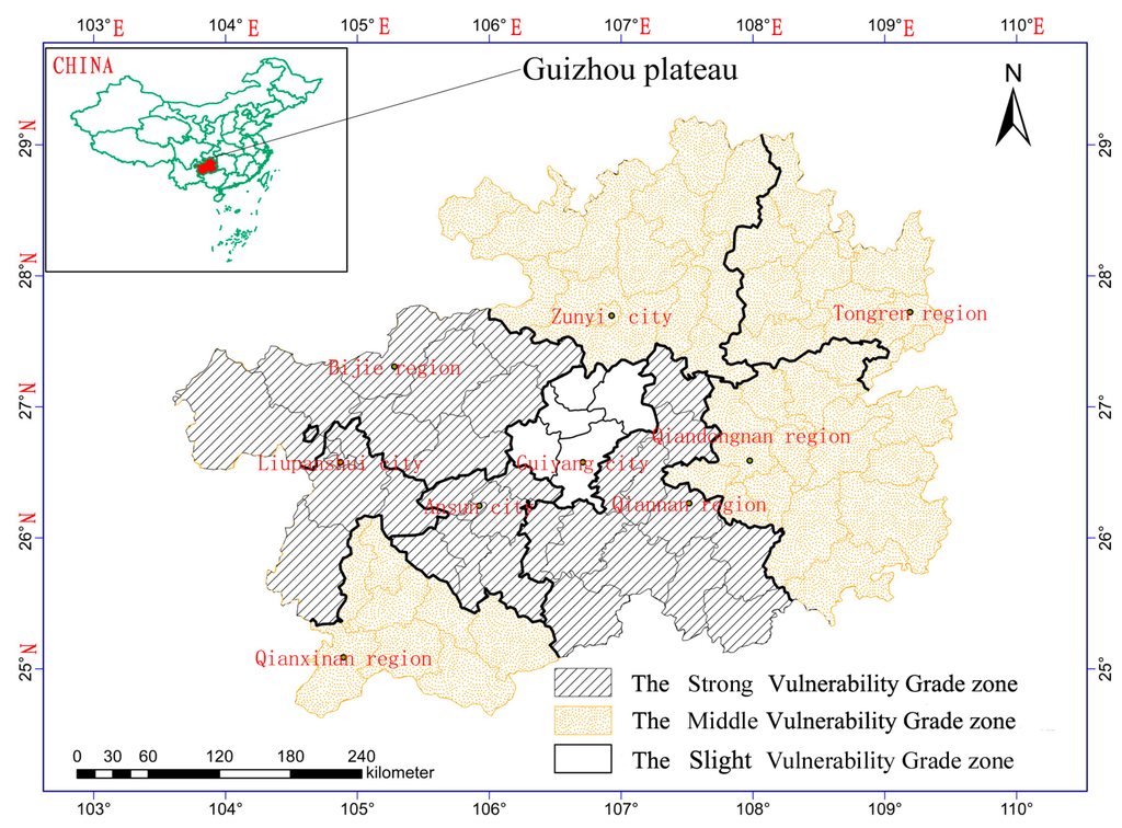 The quantitative assessment values of every district show that Guizhou Plateau could be divided into three vulnerability coupled human-natural system zones. Western, west center, southern, and northwest belong to the strong vulnerability degree zone. Eastern, northeast, southeast, and southwest belong to the middle vulnerability degree zone. The central area of Guizhou Plateau belongs to the slight vulnerability degree zone (Figure 1).