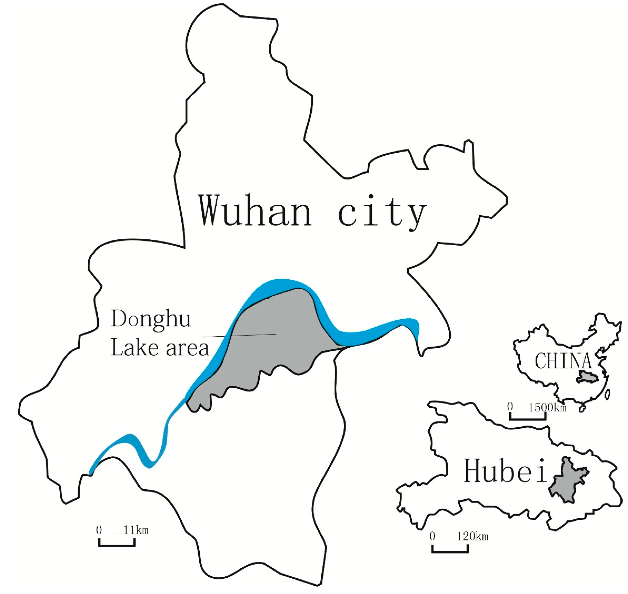 Figure 1. Location map of Wuhan and Donghu lake area.