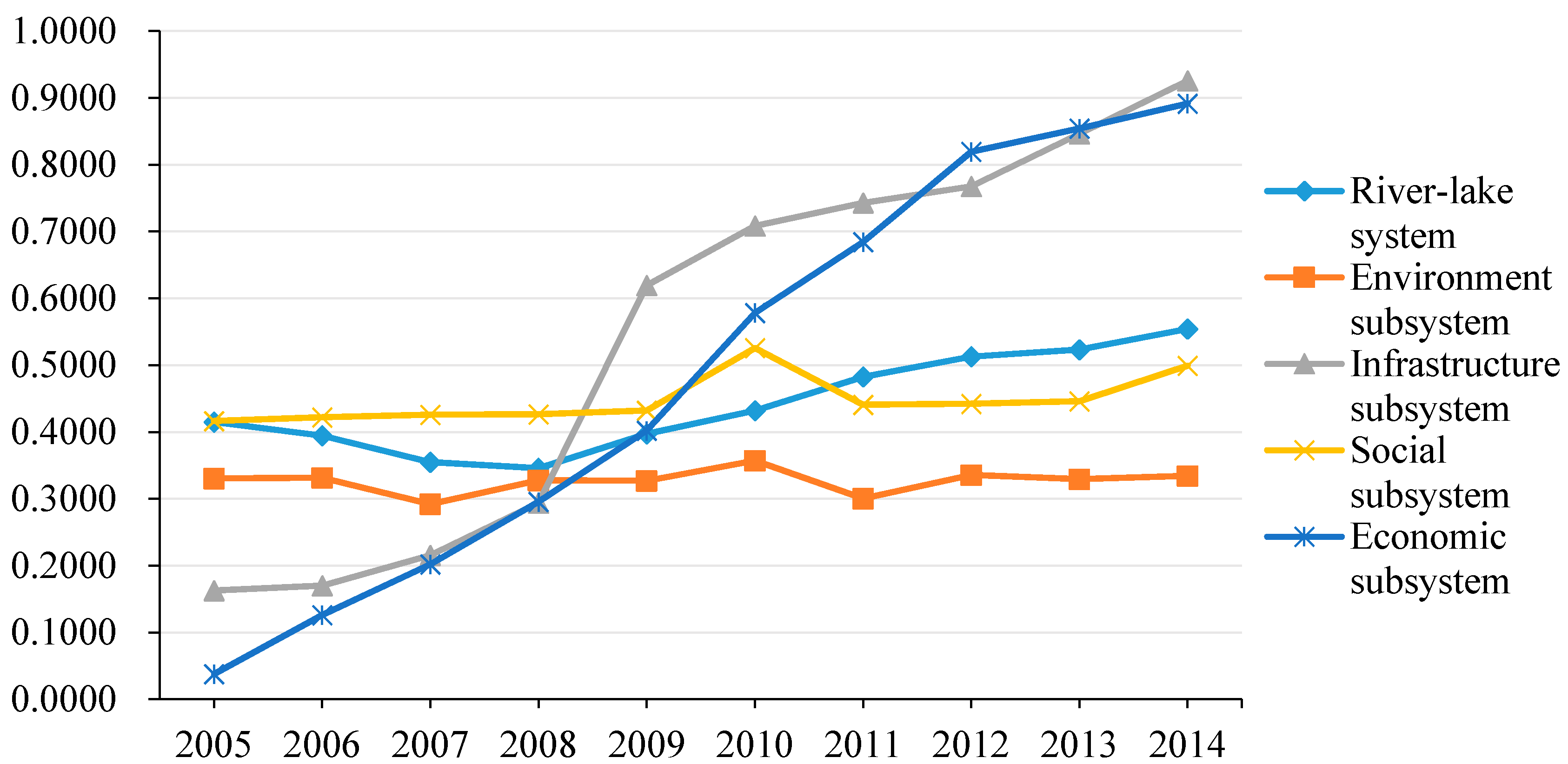 Figure 2. Line graph of the development degree of each system, 2005 to 2014.