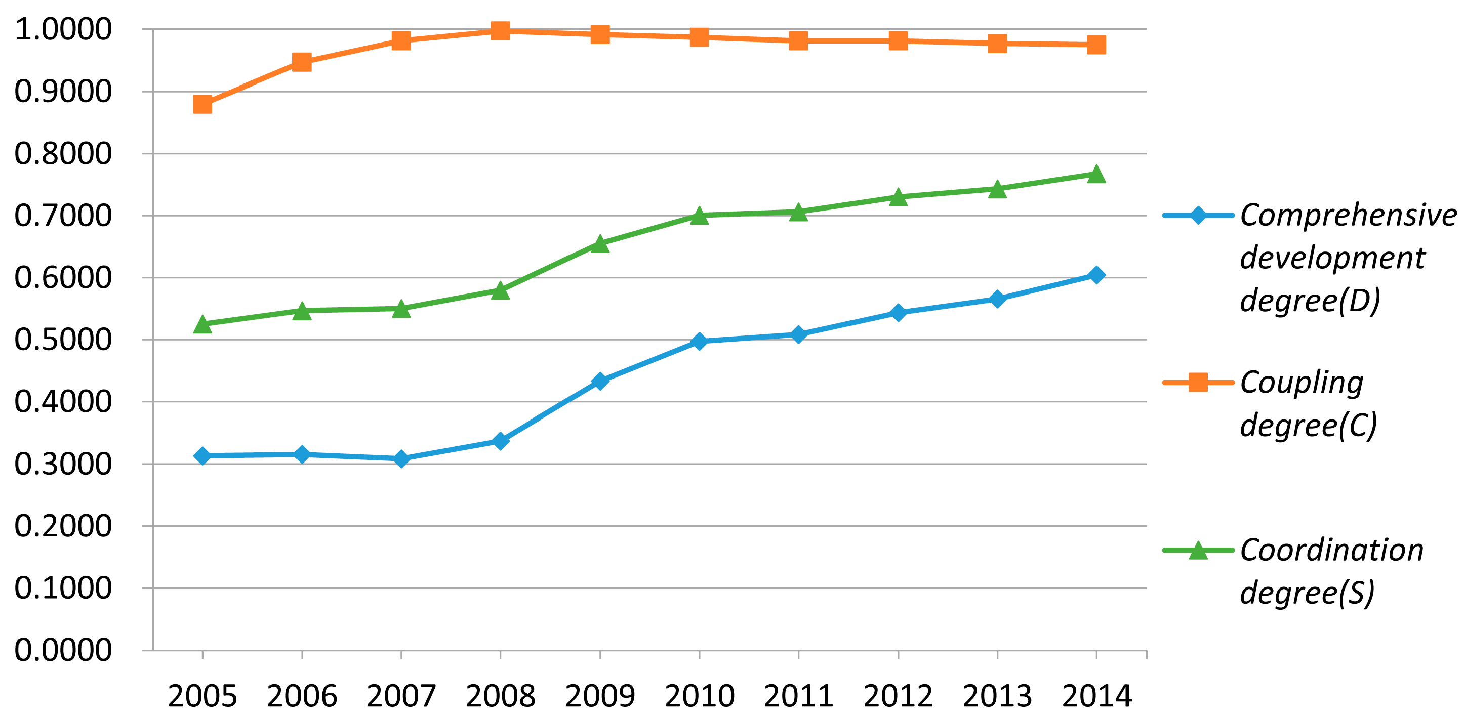 Figure 3. Line graph of comprehensive development degree, coupling degree, and coordination degree of the compound system, 2005 to 2014.