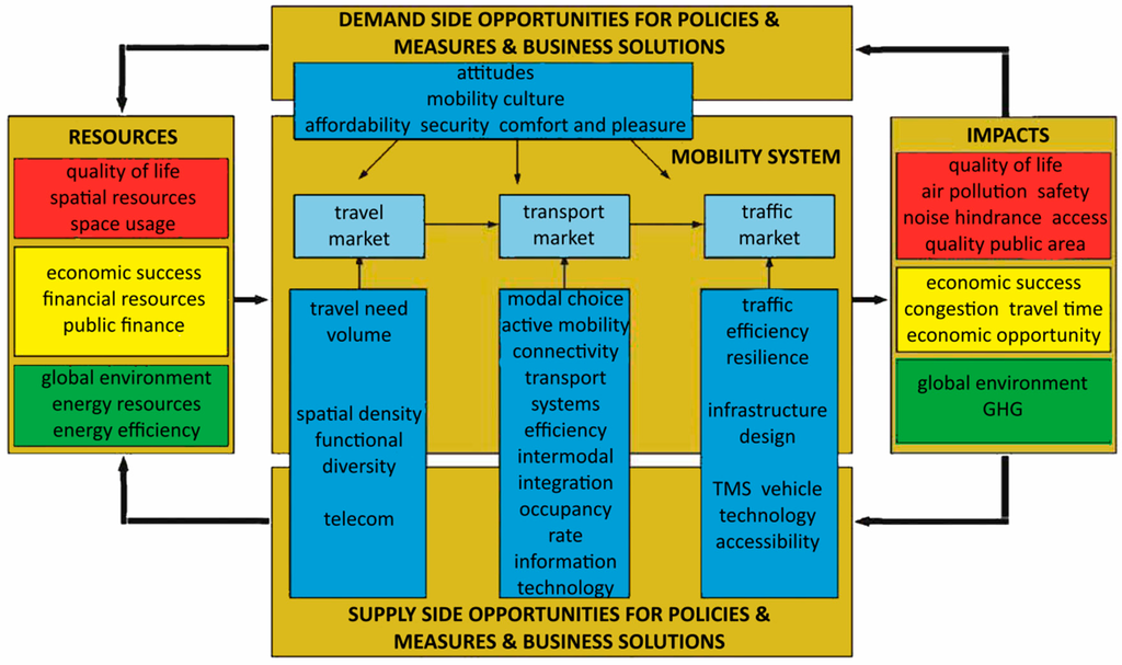 The differentiation between travel, transport and traffic is not only relevant for academic research: it refers to different “markets” (or arenas) in which different types of actors are confronted with certain types of demand and supply decisions within the mobility field. A complexity is that these three markets are interrelated (Figure 1), meaning that certain mobility solutions offered by the transport business within one of these markets might affect—intentionally or unintentionally—the performance in the other markets.
