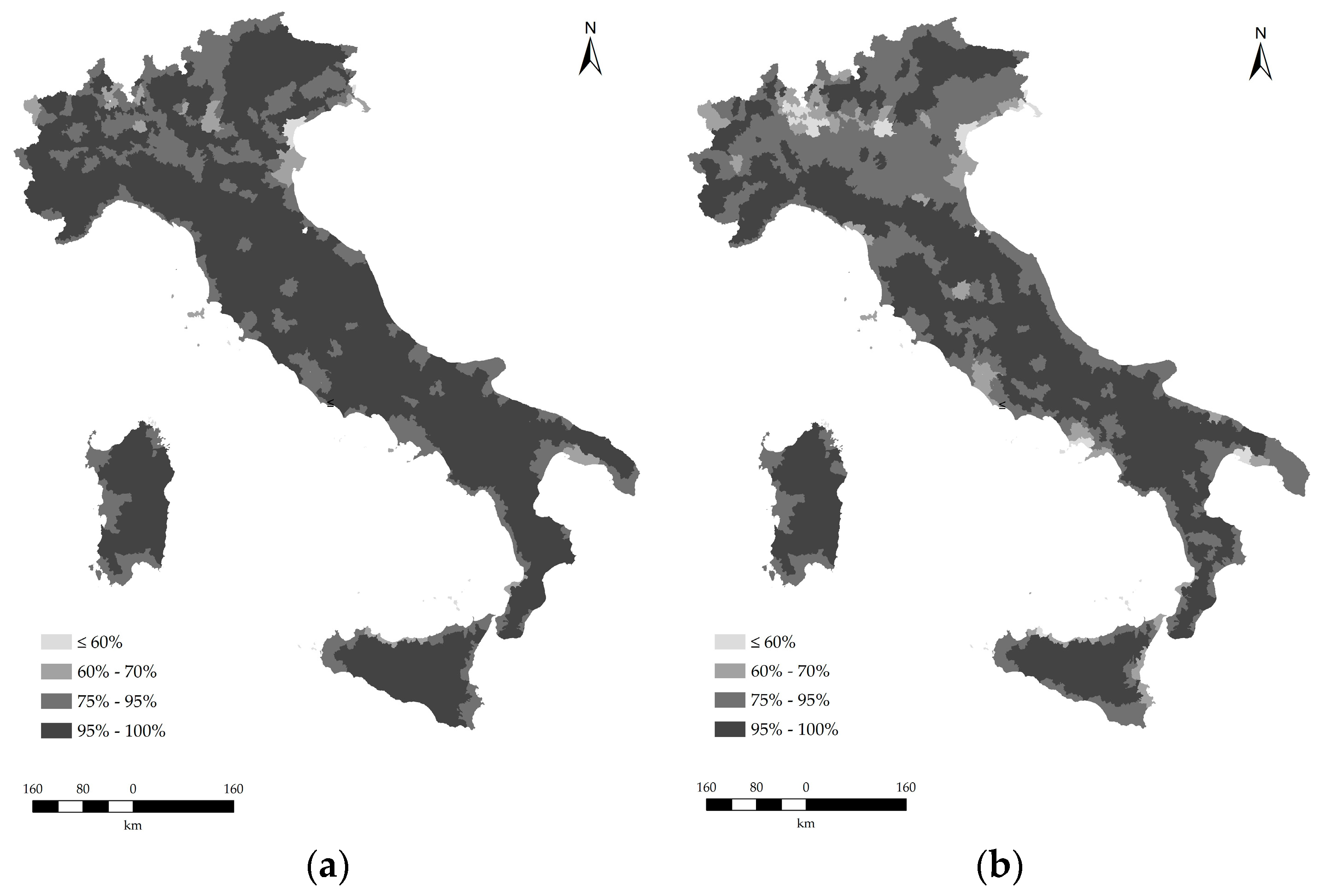 (a) Map of the Italian agro-forest districts illustrating the percentage of cropland and forests in the total district surface area for 1960; (b) Map of the Italian agro-forest districts illustrating the percentage of cropland and forests in the total district surface area for 2010.