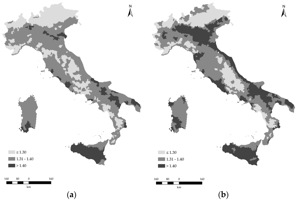 (a) The level of land susceptibility to degradation in the Italian rural districts measured by the average ESAI score for 1960; (b) The level of land susceptibility to degradation in the Italian rural districts of Italy measured by the average ESAI score for 2010.