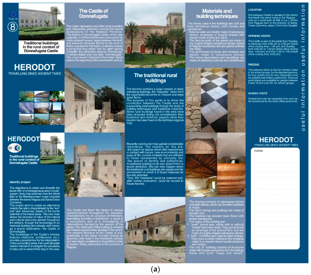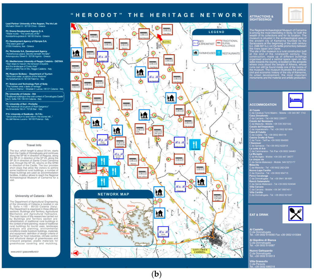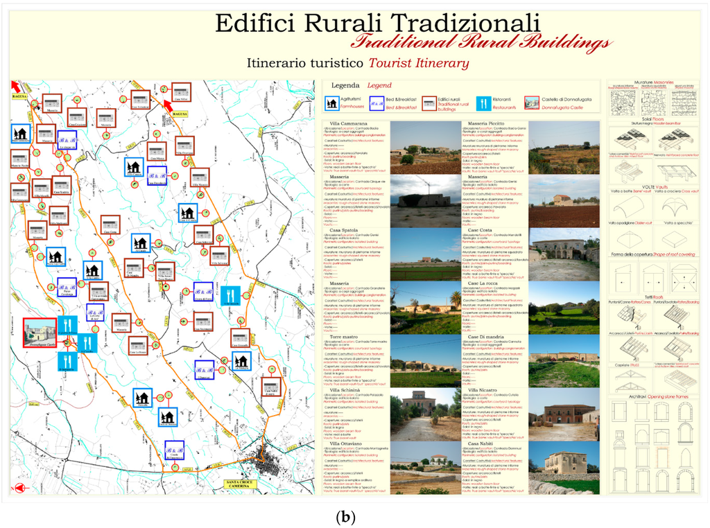 - Porto, S.M.C.; Leanza, P.M.; Cascone, G. Developing Interpretation Plans to Promote Traditional Rural Buildings as Built Heritage Attractions. Int. J. Tour. Res. 2012, 14, 421–436. [Google Scholar] [CrossRef]