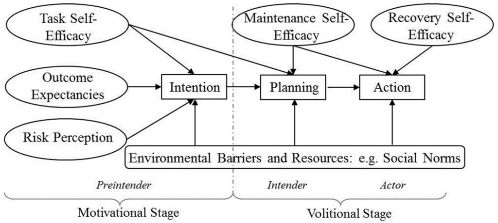 According to Schwarzer, the relevance of the constructs considered depends on the stage within the behavioral change process. This process can be divided into two stages, namely the motivational and the volitional. The model suggests grouping individuals into “pre-intenders”, “intenders”, and “actors” by assessing their different psychological states. “Intenders”, for example, are individuals who have reached the volitional stage. They are motivated to change but hesitate, lacking the right skills to turn intention into action. In the action phase, people have already adapted their mindset, are making plans, and are stable in their behavior. Utilizing these differences, behavior-specific stage algorithms can be employed to assess the stages [30] or when it comes to designing interventions. In designing an intervention for highly motivated individuals, for instance, only treatment components aimed at planning and action control have to be taken into account. In this context, self-efficacy (either as maintenance, task, or recovery self-efficacy) and social norms (which function as barriers or resources) are especially relevant.