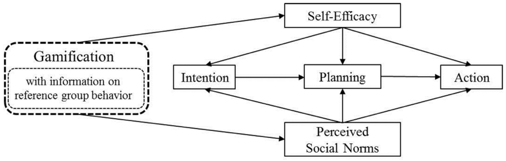 Nevertheless, when focusing on “intenders” the integration of external motivation by means of immediate feedback, in the form of points awarded for successful actions and the visualization of progress using a progress bar, may help activate behavior or compensate for the lack of intrinsic motivation towards sustainable nutritional behavior. A leaderboard function would enable individuals to compare themselves with other behaviorally relevant members of a reference group (e.g., their immediate peers), allowing them to assess their own strengths and fostering a spirit of competition. For “intenders” at the top of a leaderboard, a feeling of achievement may arise together with feelings of social relatedness due to shared goals and experiences and thus to a greater feeling of self-efficacy as well as intrinsic motivation [76]. Simultaneously, the leaderboard symbolizes the descriptive social norm by providing information on the “normal” behavior of relevant others. This might be particularly valuable for insecure people, unsure of whether they will be able to change (e.g., on account of low self-efficacy), since they could be motivated to continue because conforming to the perceived social norm and getting feedback would allow them to measure how close they already are to the accepted standard. If they happened to be close to the other people involved (proximal reference group), this would be even more effective. Because “intenders” are motivated to make changes but are held back by issues of self-confidence, this lack of self-efficacy could thus be remedied. If correctly designed and applied, gamification could initiate a process through which behavioral change may be fostered. It may function as an intervention affecting social norms and self-efficacy by presenting information about reference group norms in relation to the behavior of oneself and significant others. Consequently, gamification may affect the most crucial factors of the HAPA model, as depicted in Figure 2.