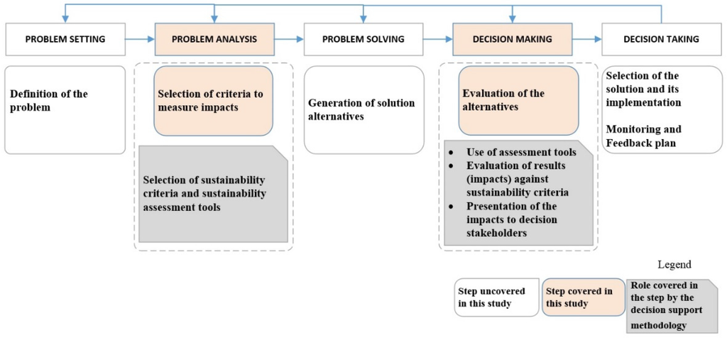 The loop-arrow in Figure 2 points out that the sub-steps of the decision support methodology could be repeated until the stakeholders can agree on a final solution. It is important to note that the use of this framework relies on the assumption of stakeholders having already selected the reconfiguration alternatives of the EMS (problem-solving step of Figure 1). Santoyo-Castelazo and Azapagic [24] have also proposed a relevant decision support framework for integrated sustainability assessment of energy systems. This research additionally proposes a range of existing ways to undertake the evaluation of alternatives related to EMS.