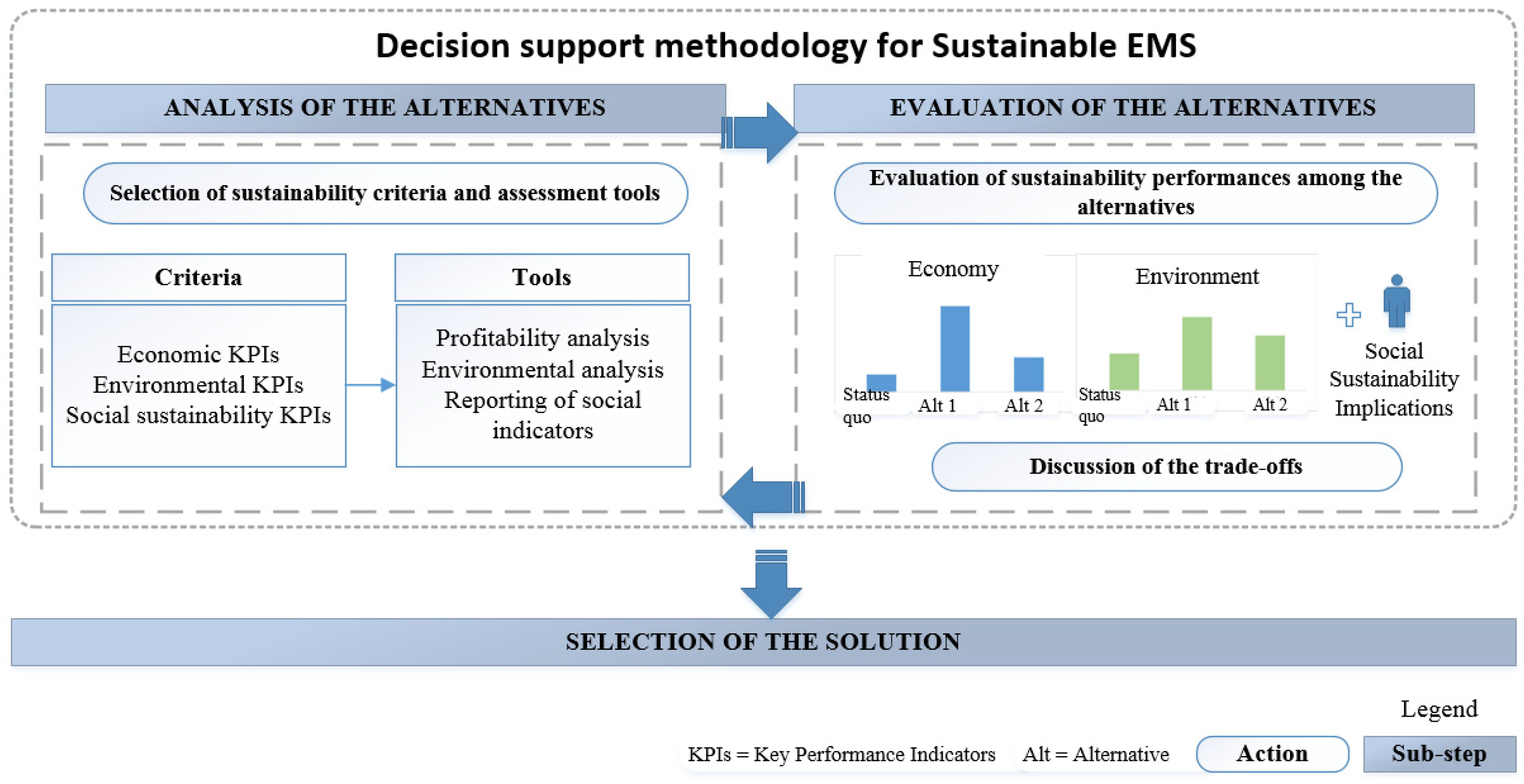Alenka and Jurij [34] have shown how different qualities and quantities of information visualization affected decision making in various situations. Consequently, results from the decision support methodology should be shown in a way that allows a straightforward comparison of the different change proposals under a sustainability-oriented perspective. This would facilitate discussions on possible trade-offs and enable the selection of the most sustainable EMS at hand (which might coincide with the as-is system in some cases).