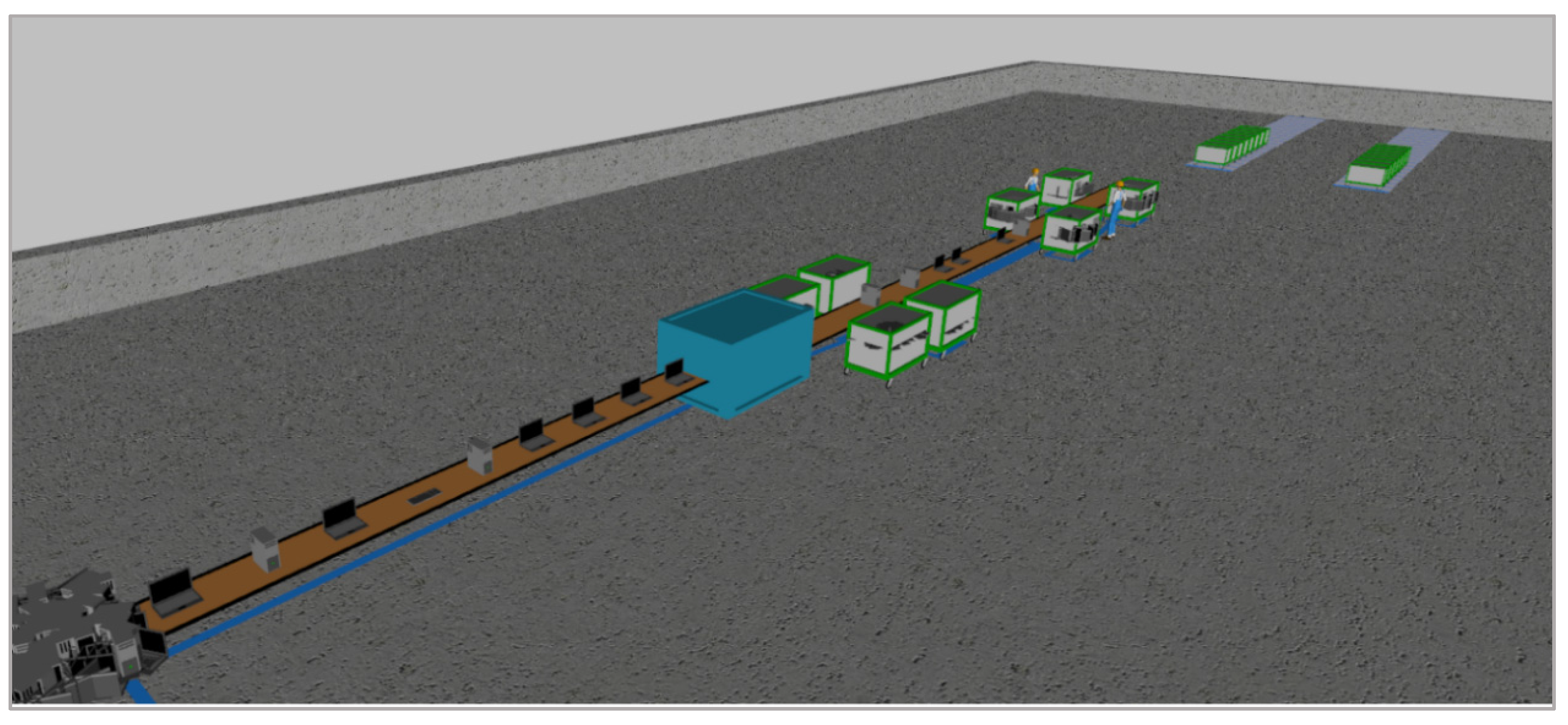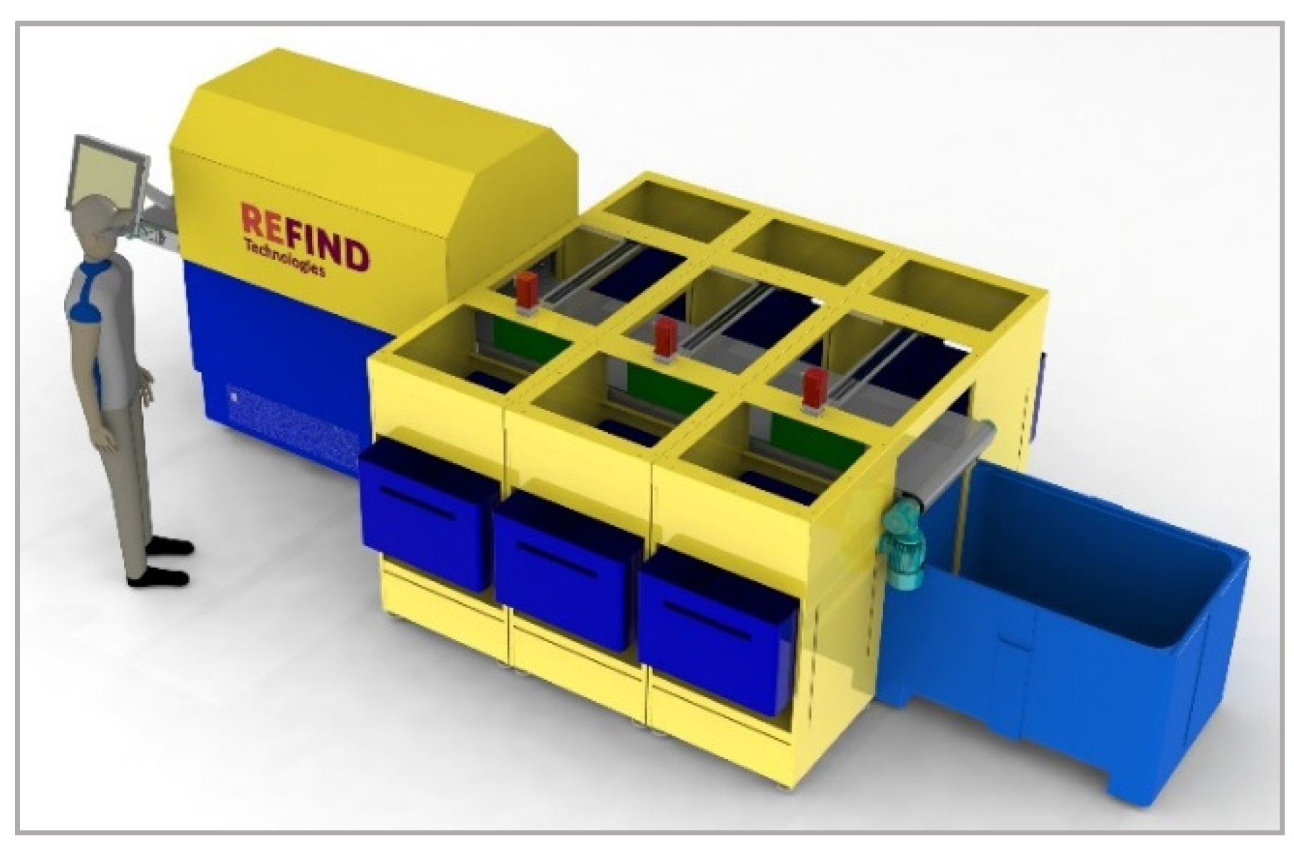 The aim of reconfiguring the e-waste system is to develop an intelligent, automated piece of sorting equipment for used electronics’ segregation and grading. The research project “WEEE ID” (WEEE Identification) [41] put together knowledge and competencies from industries and academia in order to develop a sorting unit essential for small- and medium-sized recycling plants. This sorting unit aims to prevent operators from being exposed to hazardous substances from segregation processes and enables higher recycling rates within downstream processes, thanks to increased sorting efficiency and accuracy. The piece of automated sorting and grading equipment for e-waste puts the development into reality in a small-scale demonstrator called e-grader. The CAD representation of the e-grader demonstrator is represented in Figure 3.