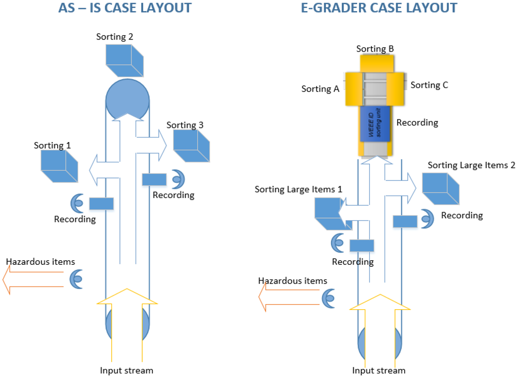 The alternatives being evaluated in this case consisted of the adoption of the sorting unit versus maintaining the status quo of the facility with manual sorting. Figure 4 shows both the as-is layout and the layout being reconfigured by means of the implementation of the e-grader.