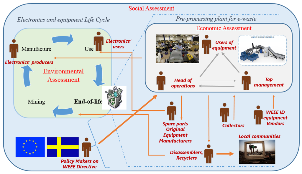 - sustainability-related assessments on e-waste treatment processes found in the literature focused on environmental assessments or alternatively on social sustainability assessments; the former have been primarily delivered through a life-cycle assessment methodology, as in [15,16], whereas the latter, which focused primarily on health conditions of workers, have been made through in-depth interviews [17] and reporting of health-related indicators related to human toxicity [18].