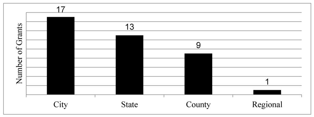 A review of the program partnerships reported by BBNP funding recipients, shows that collaborations among state, private, and civil society actors were central to the city-level implementation of energy efficiency initiatives under the EECBG program. Beyond working with the federal government to implement the grants, which were seen as the most important form of funding (71%), the majority of cities responding to the USCM survey reported partnering with members of the private sector (59%). When we look specifically at the 40 competitive grants awarded under the BBNP program, we are able to understand the partnerships more clearly. As has been previously mentioned, the BBNP program supported projects at many levels: seventeen of the grants were city-level (42.5%), thirteen were state-level (32.5%), nine were county-level (22.5%), and one was regional. The regional grant involved sub-grantees across ten states in the Southeastern US [111]. Figure 1 presents this distribution.
