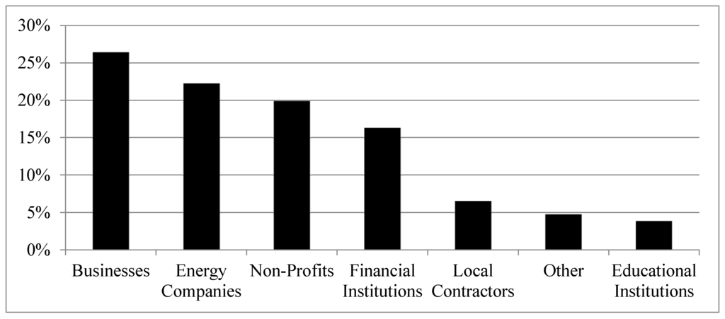 All of the BBNP grants were implemented through partnerships. In fact, the relevant program websites at the Department of Energy (DOE) and individual programs’ sites listed 337 separate partners across seven categories. Overall, the vast majority of these partnerships were with market actors rather than civil society collaborators. The most common program partners were local businesses and business alliances (such as green technology businesses, chambers of commerce, and sustainable development groups), which constitute over 26% of the total partnerships listed. Energy companies—including both public and private utilities—were the second-most common category, representing 22% of the partnerships. Non-profits, including environmental groups and community organizations and alliances, were the third-most-common partnership (20%). Financial institutions (banks, credit-unions, and other lenders) constituted about 16% of the total partners listed. BBNP programs also partnered with local contractors to assist homeowners with energy retrofits and with colleges and universities to provide “green jobs” training (just over 6% and 4% of partnerships, respectively). About 5% of partnerships fell into other categories, including sports teams and consulting agencies, which are depicted as “other” in Figure 2.