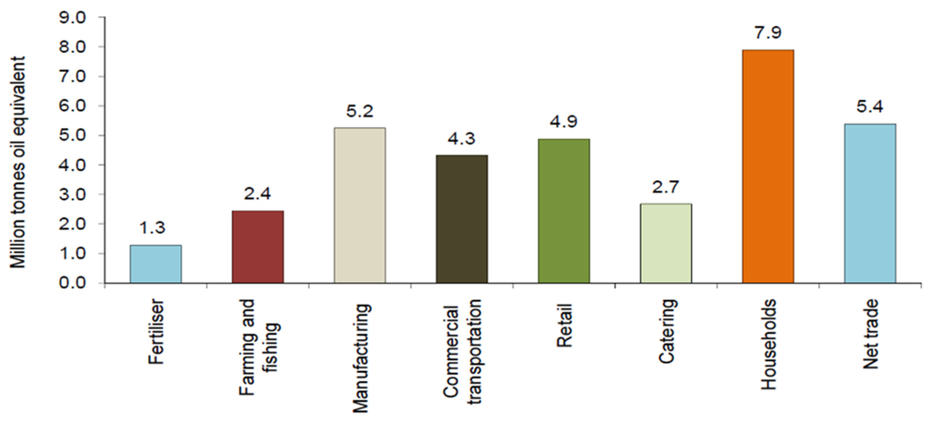 If the current minimum loss and waste percentages in each food supply chain step was to be applied everywhere, approximately half of the food supply losses could be saved, and therefore their associated resources [52]. It is, therefore, clear that the application of a EWFN approach can be crucial in serving to underline the opportunity for improving overall resource efficiency offered by reducing wastage (in terms of food, energy and water) at all stages within the food chain [24,62,96] and can foster productive recycling of food no longer fit for consumption as animal feed or as a source of energy [7].