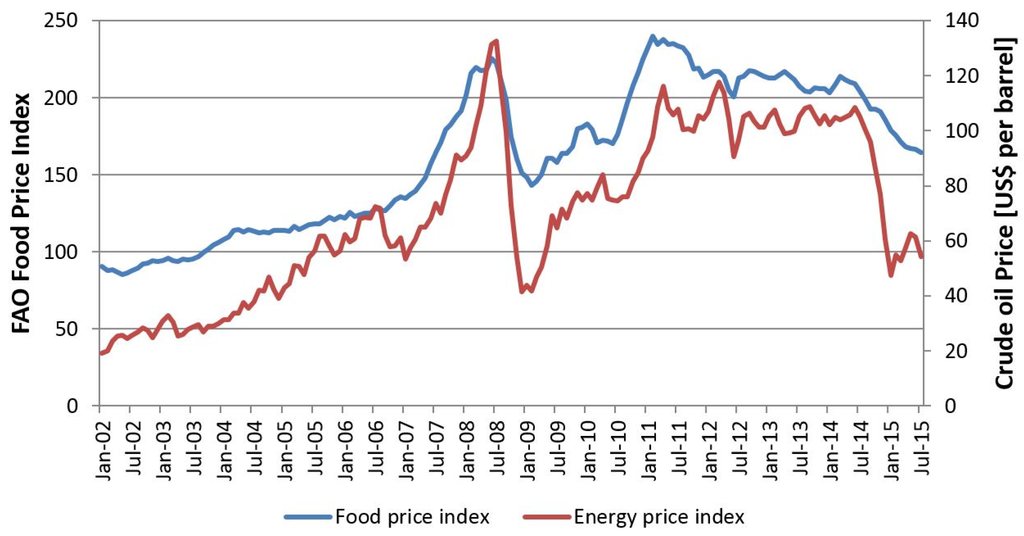 Figure 3 shows just how closely interconnected the elements of the nexus are by showing the correlation between food and energy prices. This close connection is a consequence of the reliance of modern agriculture on fossil fuels and of first generation bio-fuel expansion, which has made energy and food production become competitors for land and water [10,12,15]. This tension between energy and food represents a case in which a trade-off can be made considering all aspects of the nexus.