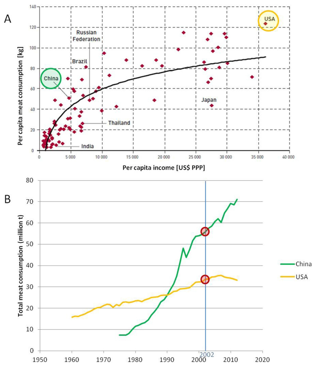 A comparison between per capita and total meat consumption in China and in the USA in 2002. (A) The relationship between meat consumption and per capita income in 2002 (Adapted from [43]); (B) Meat consumption in China and the United States 1960–2012 [44] .