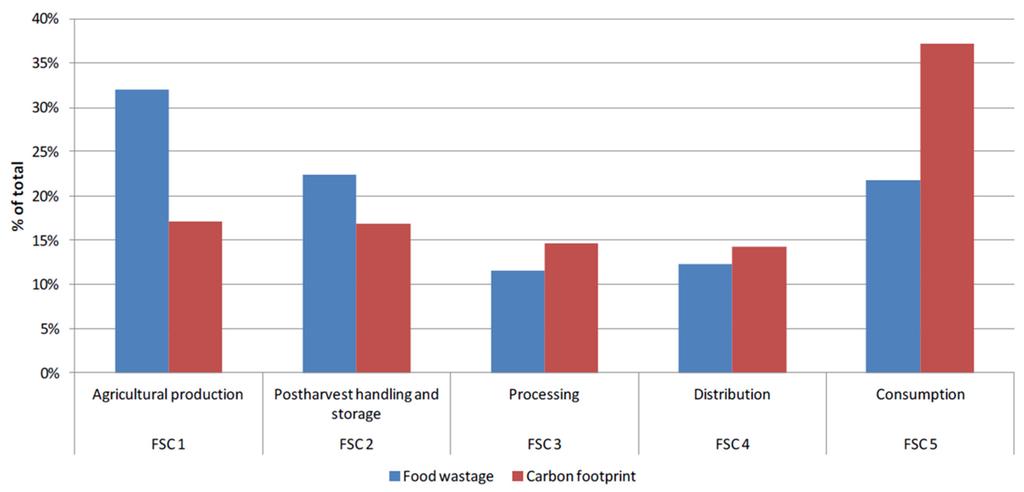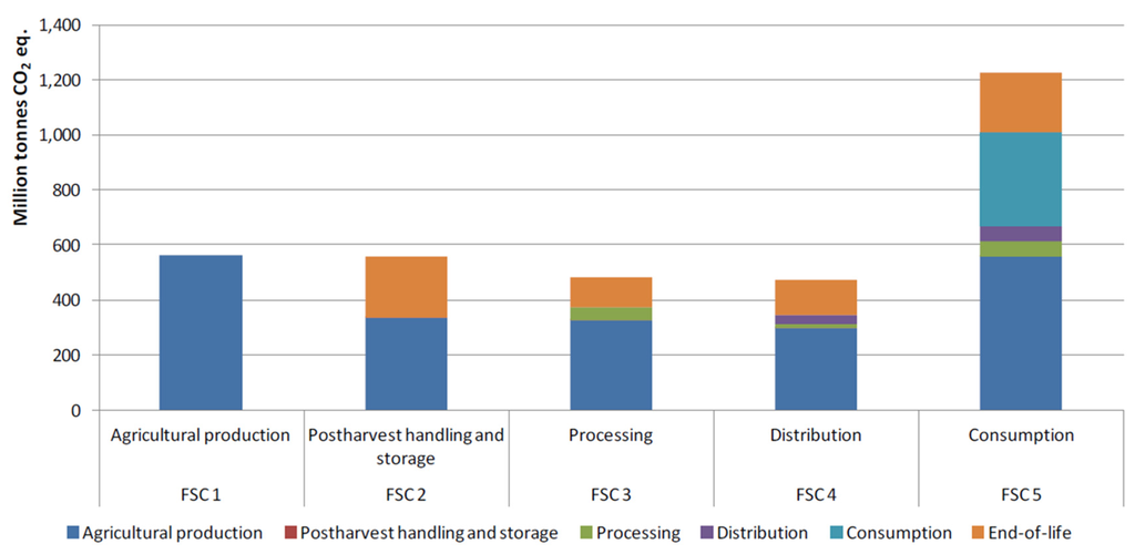 The impact of food waste and losses on the environment, in terms of the resources involved in the production, processing, transport and consumption stages was highlighted by the FAO in its Food Wastage Footprint report [62], in which for the first time the impact of food wastage on climate change, biodiversity, water and land was assessed at a global level. Figure 5 and Figure 6, extracted from this report, illustrate the impact on climate change deriving from food wasted at each phase of the supply chain, highlighting how the later in the supply chain food is wasted, the higher the impact will be, due to the accumulating impacts of the previous phases.