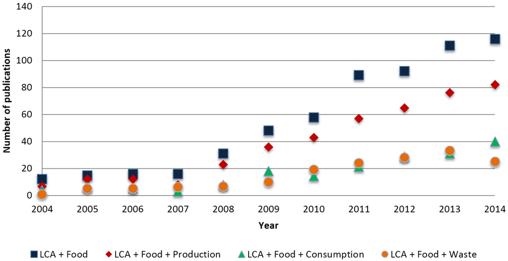Number of peer reviewed articles published between 2004 and 2014 related to LCA and food. These results came from Scopus when using “LCA” OR “Life Cycle Assessment” AND “Food” as “Title, abstract, keywords” respectively, and subsequently refining the search adding the words “Production”, “Consumption” and “Waste”.