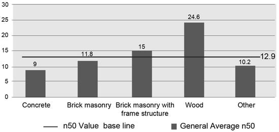 The database contains the values of walls with five different materials: concrete, brick masonry, brick masonry with a frame structure, wood and other materials (Figure 1). The pressurization test procedure was performed on each one of the homes, covering all the openings (latticework and others) and hollows to, in this way, obtain the specific value of the opaque exterior wall. According to the analysis performed on the database, it is established that the average airtightness level of homes in Chile is around 12 ach, where its variation is going to depend mainly on the type of construction system of the envelope.