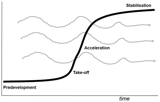 When analysing transition dynamics, different levels in time and functional or geographical aggregation can be distinguished. These have resulted in the ‘multi-phase’ and ‘multi-level’ frameworks, which have been extensively described in the literature relating to transitions [11]. The multi-phase concept [29,30], focusses on the direction, speed and size of transitions and describes a transition through time as an S-shaped curve that goes through four phases (see Figure 2 and Figure 3):