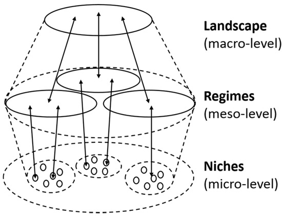 The multi-level perspective introduces the idea that socio-technical systems can be studied by differentiating between three levels: the niche-level at which innovative practices are developed, the regime-level which provides structure and stability to a system, and the landscape level which comprises long-term trends and exogenous events that might put pressure on the regime. Transitions can occur when developments at these three levels align [11,31].