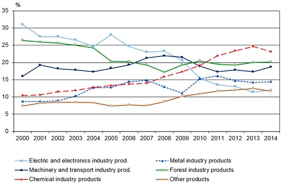 Finnish exports per industry 2000–2014 in % of total exports (Finnish Board of Customs, 2015 [36]).