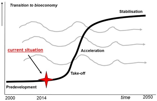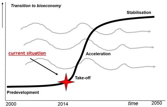 The envisaged shift and growing societal efforts to move away from fossil fuels and resources and use renewable natural resources, as subsumed under the bioeconomy, fit neatly to the conceptualisation of a sustainability transition as outlined above. The case for the bioeconomy is made by claiming that it could contribute to tackling persistent problems of food security, climate change and resource dependencies [14], but it is also clear that a number of supporters see the potential for exploiting the economic opportunities of biotechnology [21]. The transition towards a bioeconomy is complex, involving several sub-transitions including: untwining the agricultural sector from the fossil sector; untwining the chemical sector from the fossil sector; converting the chemical sector into a food-health sector; and shifting the focus in the forestry sector from bulk to high-end specialty products. Such fundamental change processes tend to be highly contested [22,23,24,25,26], involve a great number of actors across different domains and will probably take decades to reach a new dynamically stable equilibrium. As such, we propose that the concepts and insights developed in the field of sustainability transitions have much to offer in order to understand the change processes involved in the transition towards a biobased economy.