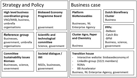 The bioeconomy governance approach starts with a vision and high ambition level. This vision has been developed by the Dutch Topsector, in co-creation between industrial partners and the Dutch government, in particular the Ministry of Economic Affairs [47]. The ambition for 2050 is to become the worldwide leader of the bioeconomy and to be a part of the top three global producers of smart biomaterials. By 2040, 40% of the resources used should be green, and by 2030 one out of three technical students should work in the bioeconomy, with CO2-emissions cut 11.6 Mton and energy use reduced by 171 PJ. The Ministry of Economic Affairs has a leading role in the biobased transition and has developed a strategy that is based on network development and co-creation. It is actually a combination of a top-down and bottom-up approach, using the principles of transition management. The aim is to bring diverse parties together, both from vested interests and emerging interests, to actively work on co-creation with these partners, and to strive for excellence and ambition (high up in the biomass pyramid), stimulating regional clusters. A key part is searching, learning and experimenting, so the parties involved developed six transition pathways in co-creation, providing the possibilities for aligning them with their own specific goals and ambitions. These six pathways are [48]: (1) biobased materials; (2) bioenergy and biochemicals; (3) integrated biorefining; (4) plant cultivation and biomass production; (5) recycling water, nutrients, and soil; (6) economy, policy and sustainability.