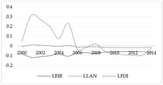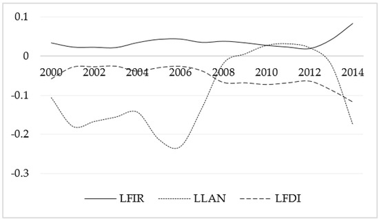 | LFDI () | 0.122 ** (1.976) | −0.142 ** (−2.330) |