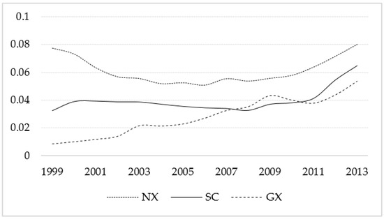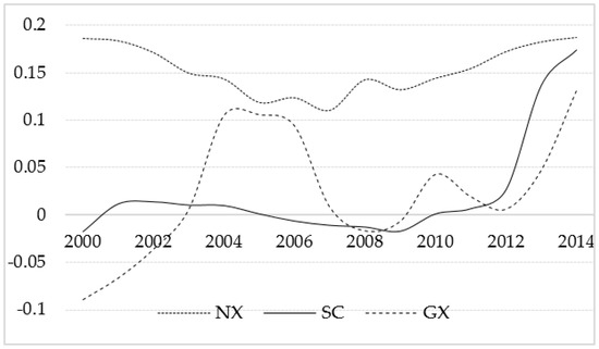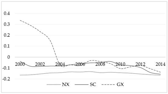 ![]() | Guangxi: Except for 2000, 2012, and 2013, the elastic coefficients were positive; in the other years they were negative. The absolute values of the elastic coefficients had a decreasing tendency before and after the turning point between the low and high regime. Hubei: The variation tendency of elastic coefficients was similar to Guangxi. In 2012–2014, the influence effect changed to be negative, and was stabilized around −0.1. Jiangsu: The elastic coefficient in 2014 was in the low regime (1.167); in other years it fluctuated around 0.1. Qinghai: The elastic coefficients in 2000–2005 were positive (0.1~1.44), but in 2006–2014 changed to be negative (−0.1~−0.023). |