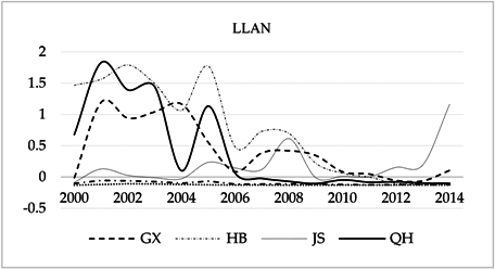 ![]() | The influence of LFIR on LTPG in all provinces was negative all the time. Guangxi: In 2001–2004, the elastic coefficient was in the low regime (−0.25, −0.21), and then shifted to the high regime (−0.153, −0.062). Hubei: In 2000–2004, it was in the low regime (−0.35, −0.23), and then shifted to the high regime (−0.18,−0.055). Jiangsu: In 2014 it was in the low regime (–0.245); in other years it was in the high regime (−0.162, −0.058). Qinghai: In 2000–2002 and 2004, it was in the low regime (−0.344, −0.172). In other years, it was in the high regime, and the elastic coefficients were stabilized between −0.086 and −0.055. |