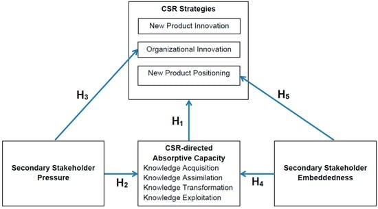 Absorptive capacity requires triggers from the external environment in order to be activated [56]. For CSR-directed absorptive capacity the pressure that secondary stakeholders put on companies can be such an activation trigger. The typical resource-dependency arguments suggest that companies adhere to secondary stakeholder claims because the continued access to vital resources controlled by primary stakeholders is at stake [4,57]. From an organizational learning point of view, though, organizational action emerges from the memory of the organization through a learning process in which new information is acquired, shared and stored [58]. From that perspective, secondary stakeholder pressure is likely to activate a learning process and, depending on the capacity of the organization to absorb such information, it may respond. The case of the world fifty largest food manufacturing corporations [44], for example, illustrates that—beyond specific issues under discussion with stakeholders—companies develop intra- or inter-organizational systems to better acquire and ultimately use knowledge from secondary stakeholders on future issues. Therefore, we hypothesize: