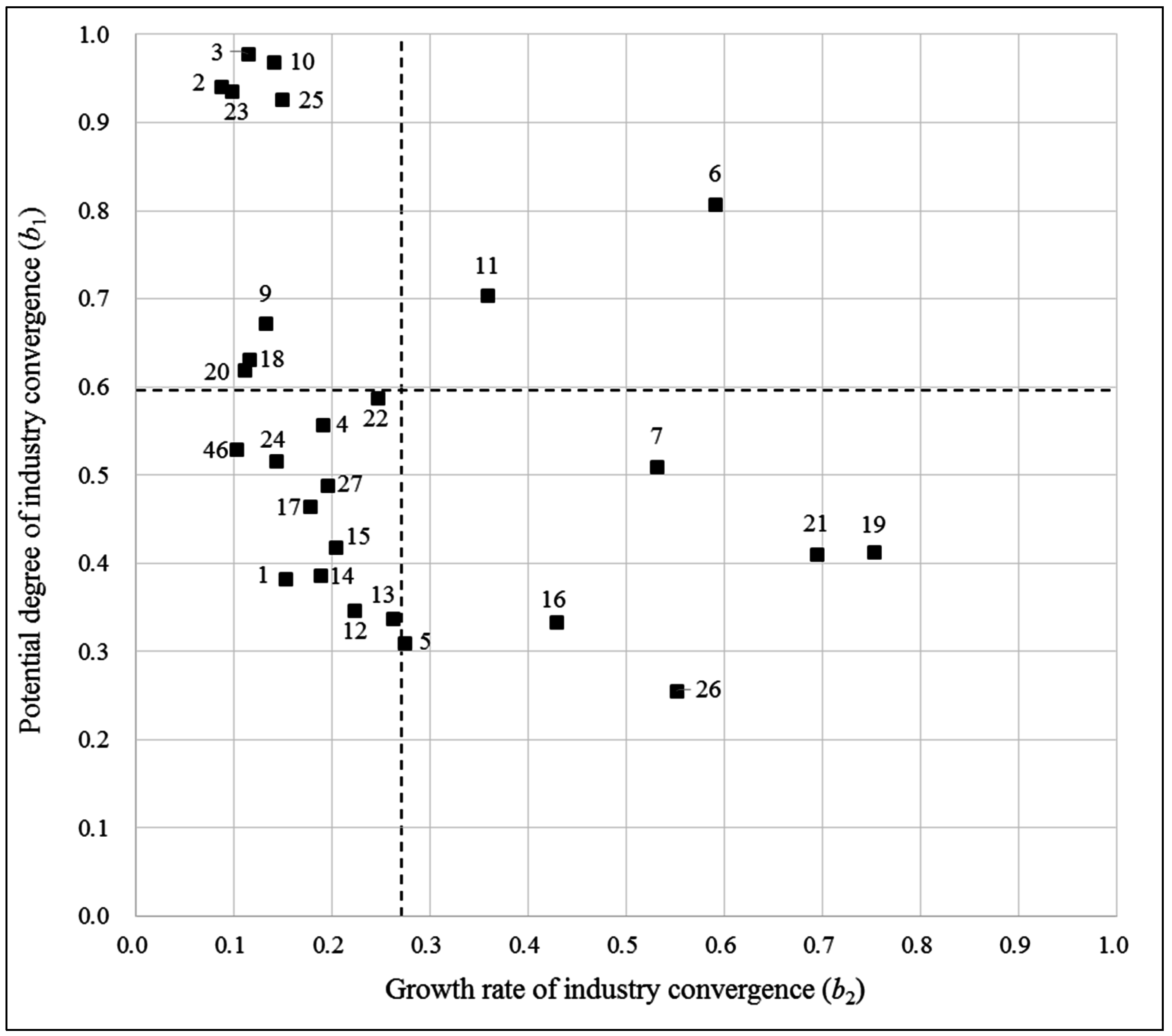 Among these three diffusion parameters, this research uses the potential degree (b1) and the growth rate (b2) of industry convergence to explore the dispersion of convergent-industry pairs (1 to 27) whose coefficients are both statistically significant. Using these two coefficients as separate axes, we draw a chart of the dispersion of convergent-industry pairs, shown in Figure 1. Furthermore, we divide the dispersion area into quadrants by the average values of those two coefficients of the convergent-industry pairs (i.e., 0.590 and 0.262 for b1 and b2, respectively).
