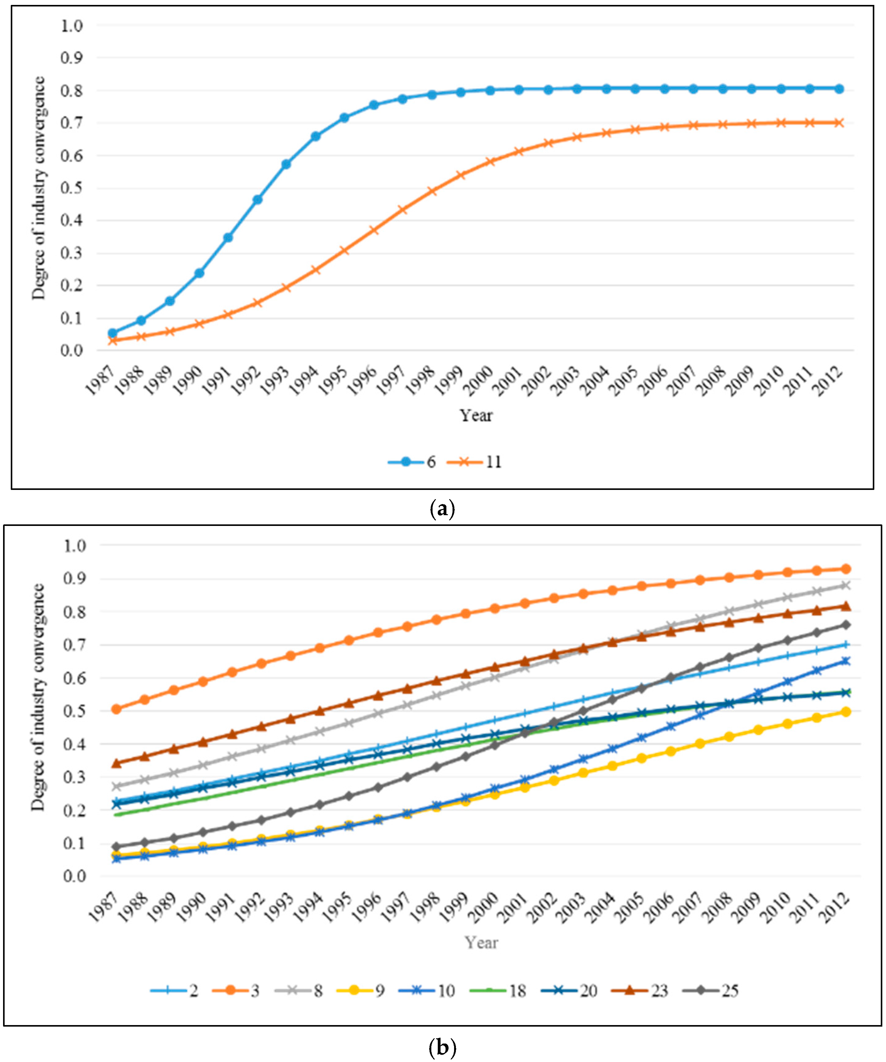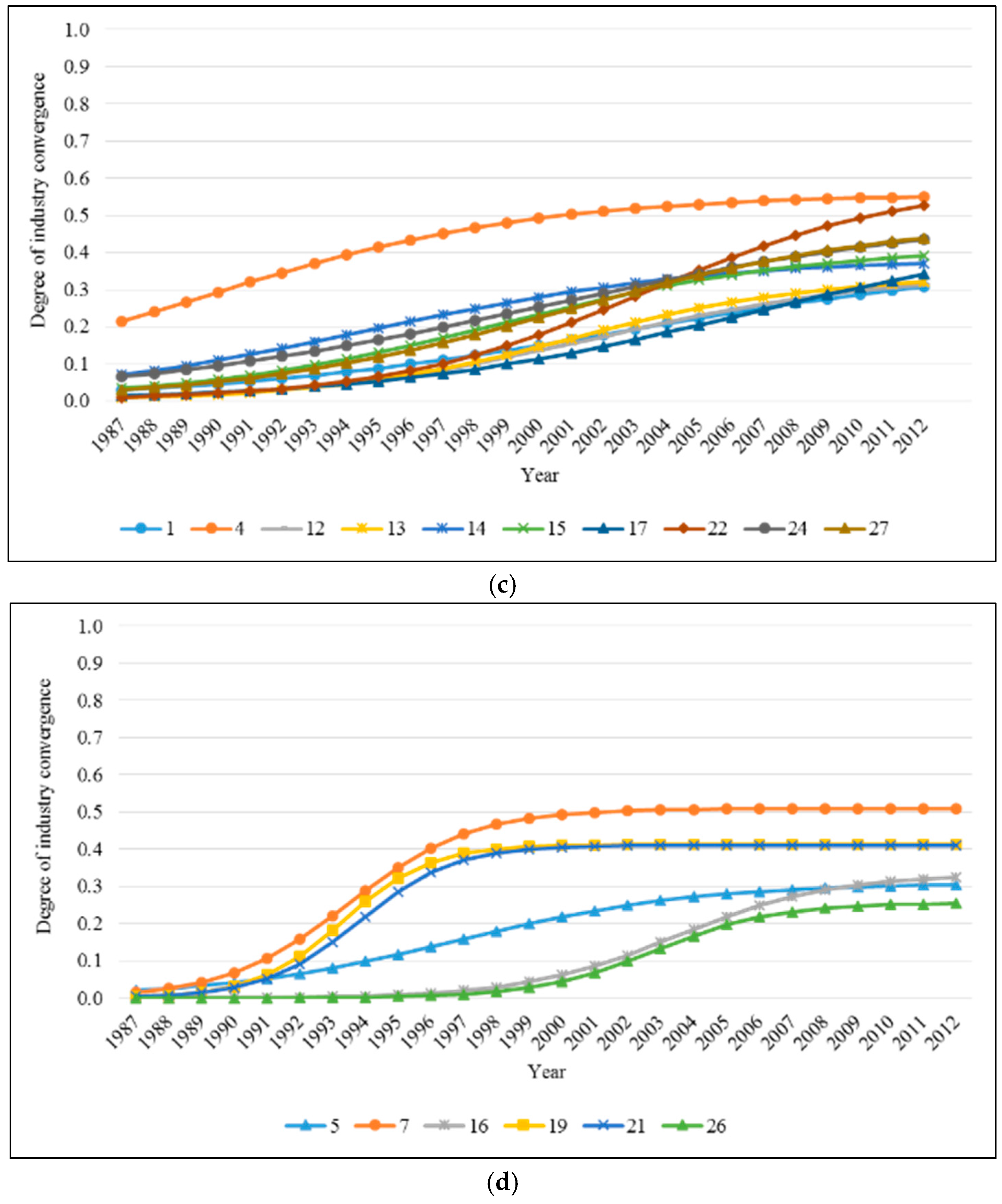 After estimating the diffusion parameters, such as the initial DIC (b0), potential DIC (b1), and the growth rate of DIC (b2), and exploring the dispersion of convergent-industry pairs using these parameters, this research also shows the diffusion patterns of convergent-industry pairs (1 to 27) in Figure 2. We find that the diffusion patterns of industry convergence are heterogeneous across the quadratic regions. In Figure 2a, the diffusion curves of the convergent-industry pairs 287–281 (6) and 356–287 (11) in the first quadrant are depicted. Interestingly, although both the potential degree and the growth rate of industry convergence of these pairs are higher than average, their convergence potential is stagnant for several years. This means that the convergence between these industries occurred rapidly and has already achieved a very high degree.