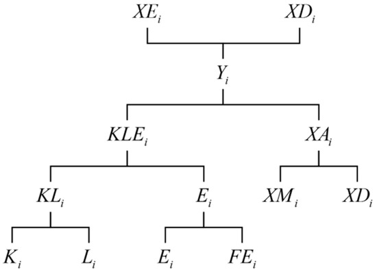 The final commodity of non-electricity industry is produced by the nested production phase (Figure 3). The production in the time period is a CES function of labor-capital-energy composite goods and Armington goods . The final commodity produced in non-electricity industry is converted into export goods and domestic goods . Armington goods followed a CES function of the import goods and domestic goods in an incomplete substitution relation.