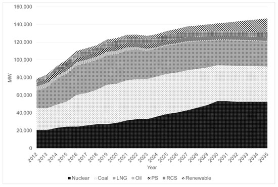 We adjust a power share of each generating technology to the data of the recent Electricity Supply and Demand Plan for the year till 2027 and the First National Energy Plan till the year of 2030. After 2030, we adjust the data to the Second National Energy Plan till the year of 2035 which stipulates just 29% for the nuclear power share and 11% for the renewable energy share of the total peak capacities, 147,000 MW.