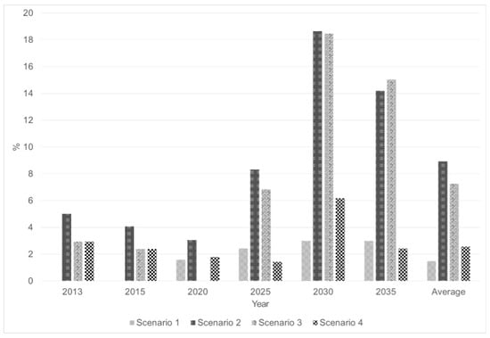 The reduction of nuclear power capacities, firstly, impacts the electricity industry itself. In this research, we analyze effects on the electricity selling price and electricity output per scenario. The changes of the electricity selling price of Scenario 2–4 respectively are shown in Figure 7. All Scenarios show the increase of the electricity selling prices. Especially, Scenario 2 and 3 demonstrate higher increases on average of 8.94% and 7.26% respectively. Scenario 3 represented as the second national energy plan shows the biggest increase of the electricity selling price from the year of 2024 and approached approximately a 15% increase. As the generation capacities from the nuclear power is not substituted by those of other generation technologies, it is anticipated that the reduction capacities of the nuclear power causes the decrease of overall electricity supply to eventually increase selling prices of electricity. Hence, the result of this research demonstrates the more phase out of the nuclear power, the higher the change of the electricity selling price.