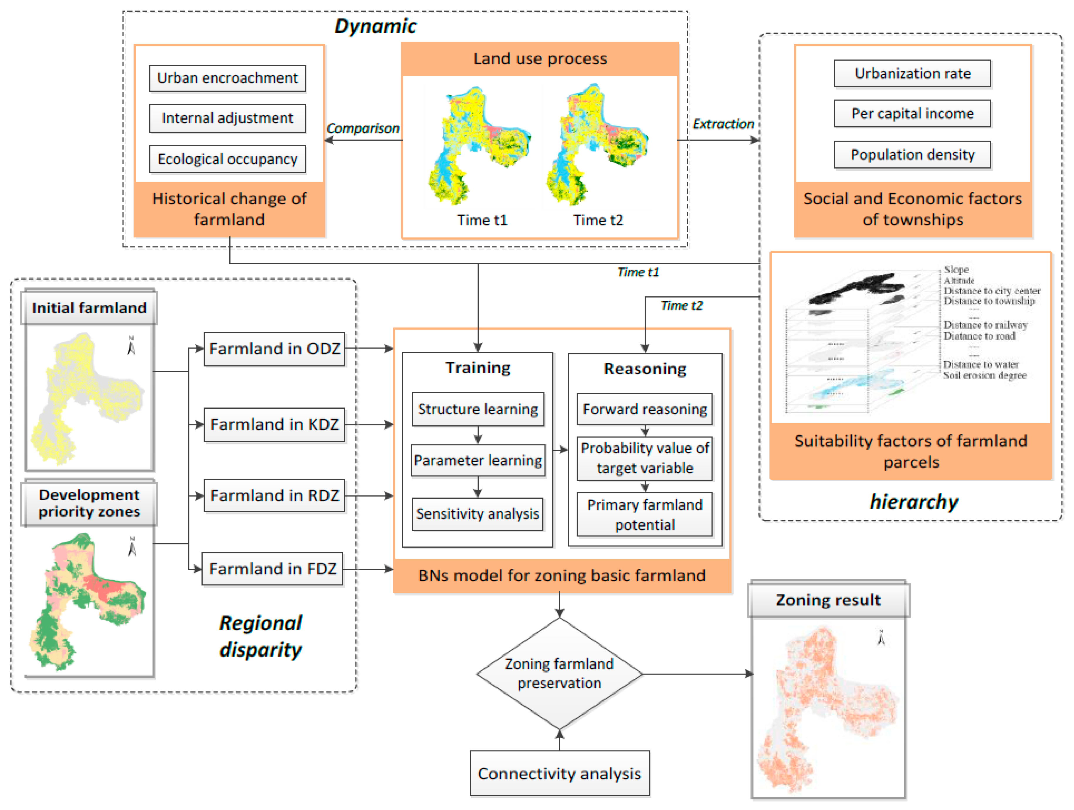 Farmland protection in China is facing multiple pressures, including urbanization, population growth and ecological degradation. Primary farmland zoning was introduced as a basic state policy to ensure national food security. Previous studies about “primary farmland zoning” have always taken the factors as global linear variables, neglecting the spatial heterogeneity of the study areas. Based on the Development Priority Zoning (DPZ) strategy, we present a zoning approach using Bayesian networks (BNs) for considering regional differences. The networks were developed using quantitative biophysical and economic variables from multi-scale and historical change data of farmland. The simulated results substantiate that this method can ensure the agricultural quality, stability and connectivity of primary farmland. Furthermore, it can further optimize the spatial allocation of primary farmland to meet the development conditions and trends of different sub-regions, promoting the balance between the farmland protection, urban development and ecological protection of certain regions.