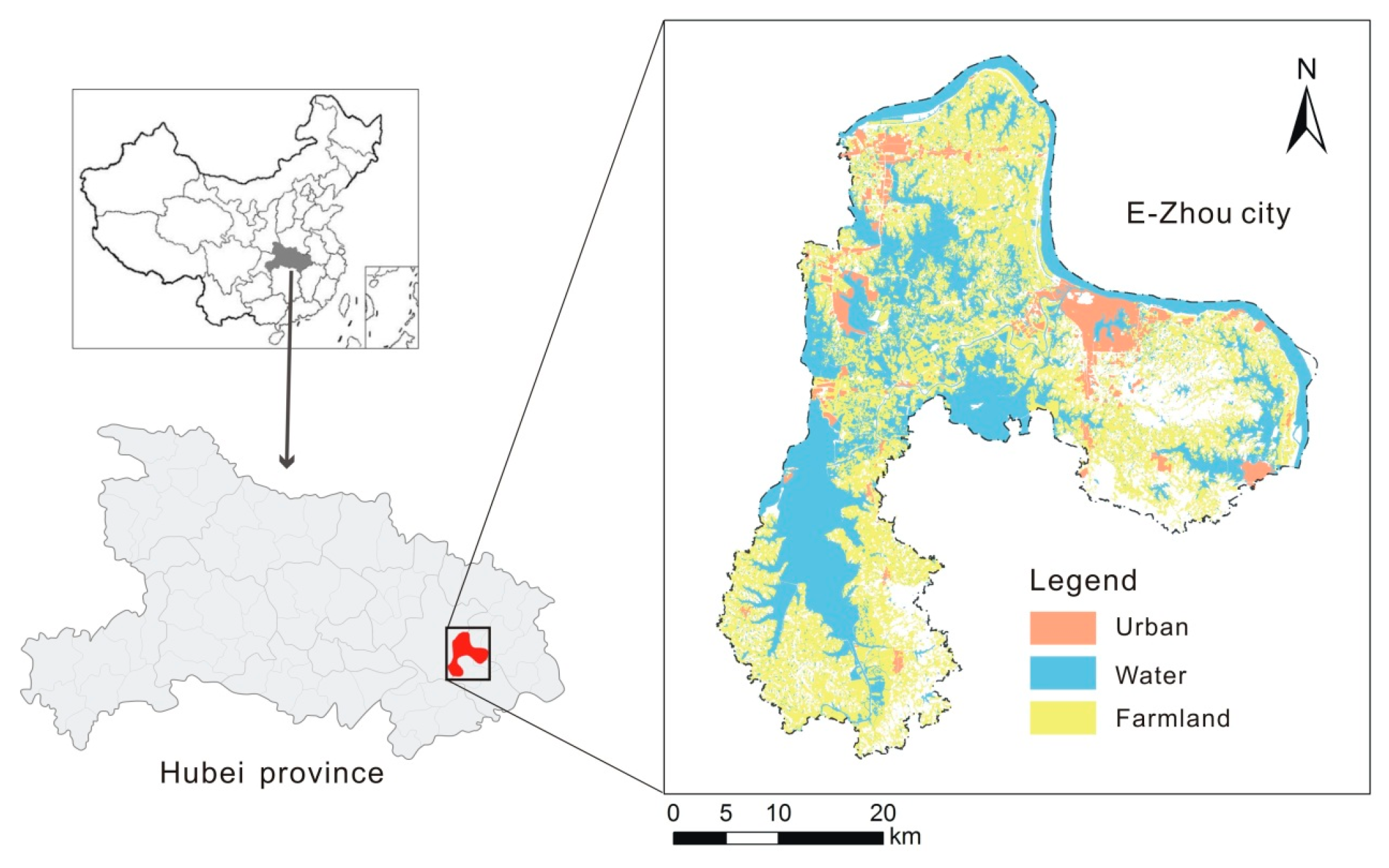 E-Zhou city of Hubei province was selected as the typical study area because of its serious loss of farmland in recent years. From 2004–2013, the total area of farmland dropped from 7.44 down to 5.80 thousand hectares, while the urbanization rate increased from 48.77%–60.48%. Several new development areas were established in optimized development zones (OPZ) and key development zones (KDZ), accompanied by urban sprawl (urban area rose from 46.2–60.1 km2) and economic growth (GDP increased from 13.04–63.09 billion yuan), at the price of 21.62% arable land loss. As a central industrial city based on mining and metallurgy, rapid urbanization and industrialization have contributed to the great encroachment of farmland, making E-Zhou city a typical experiment area of farmland protection zoning study for the medium and small cities in central China (Figure 2).
