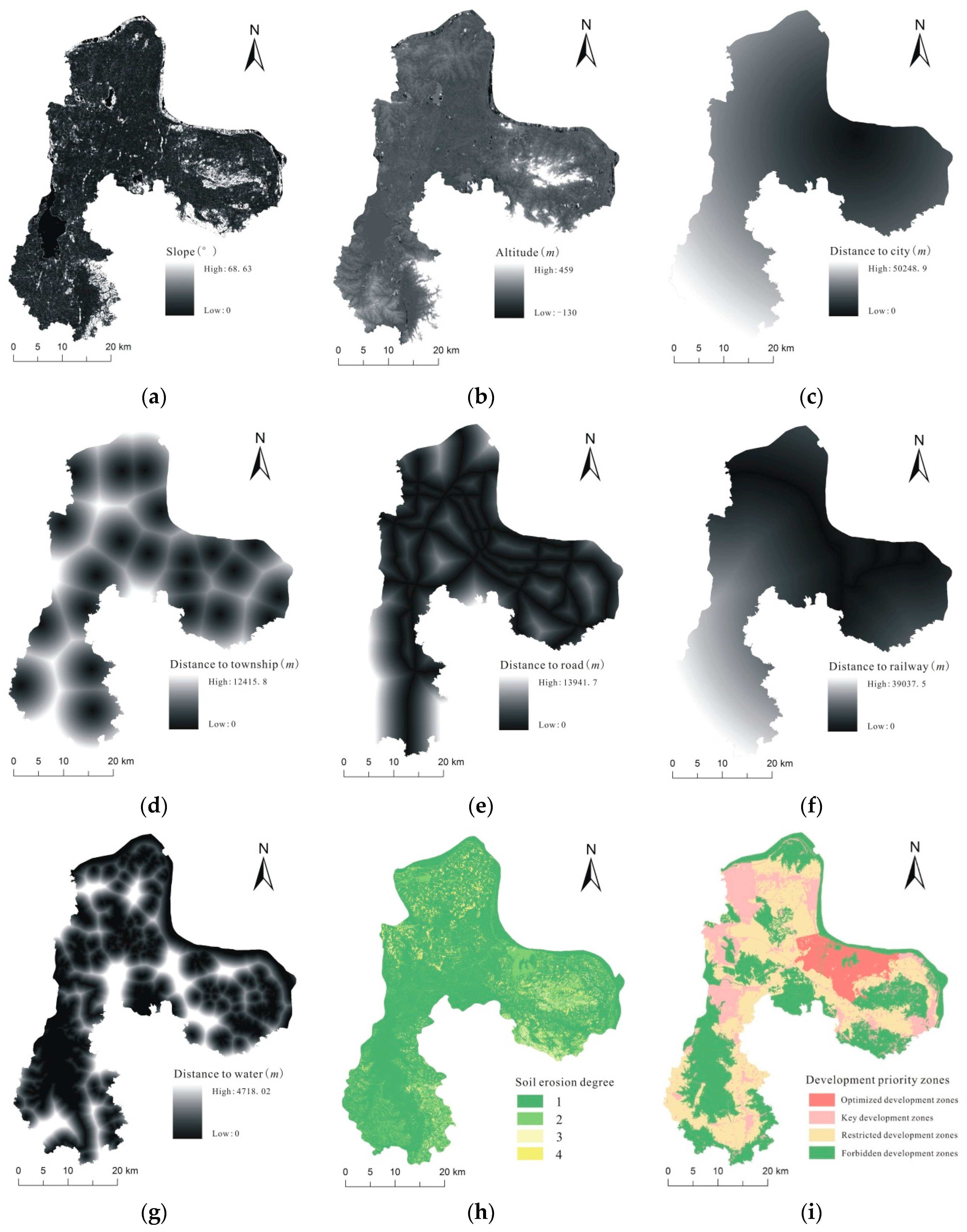 Base data: (a) slope; (b) altitude; (c) distance to city center; (d) distance to township; (e) distance to road; (f) distance to railway; (g) distance to water; (h) soil erosion degree; (i) development priority zoning.