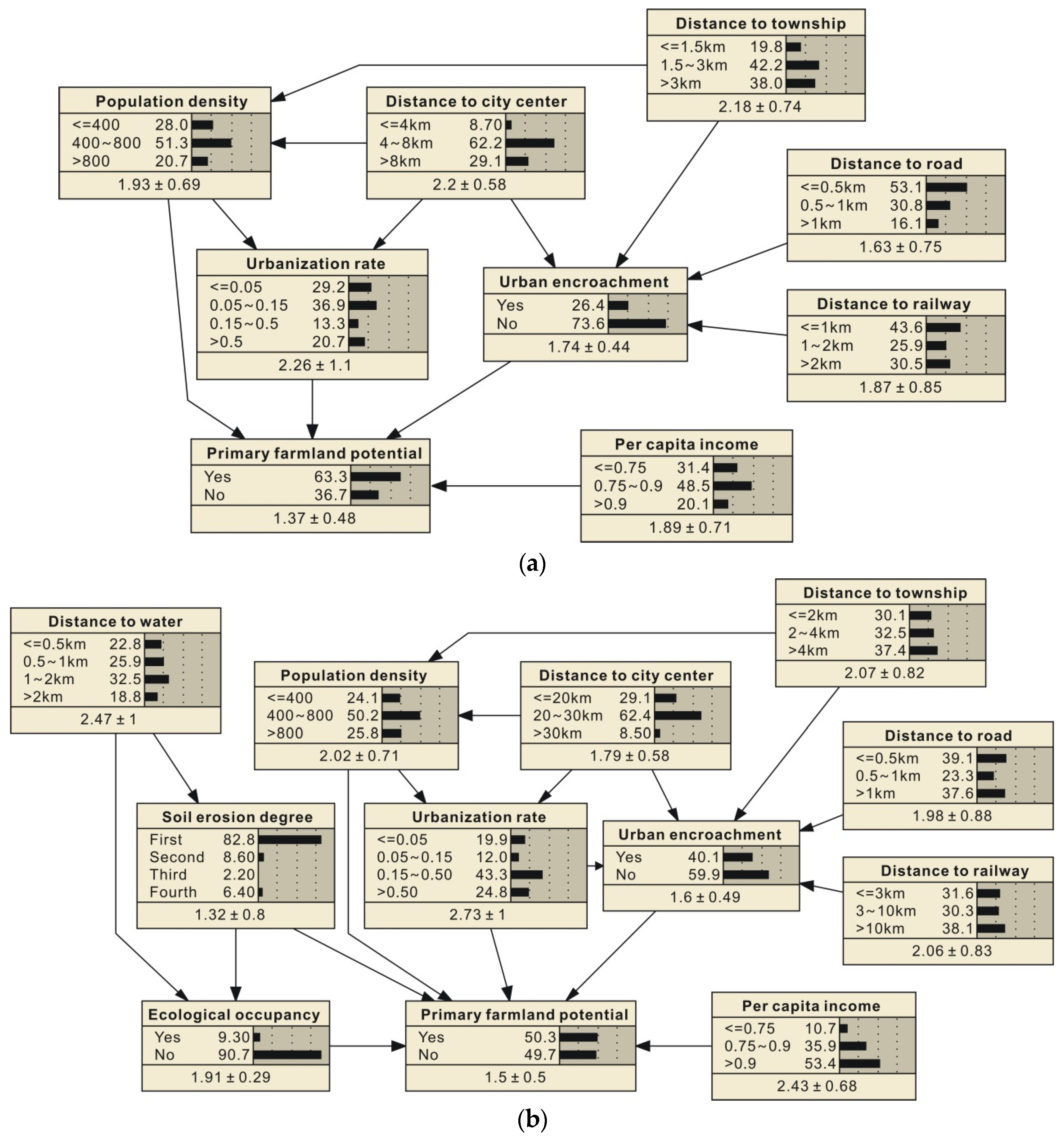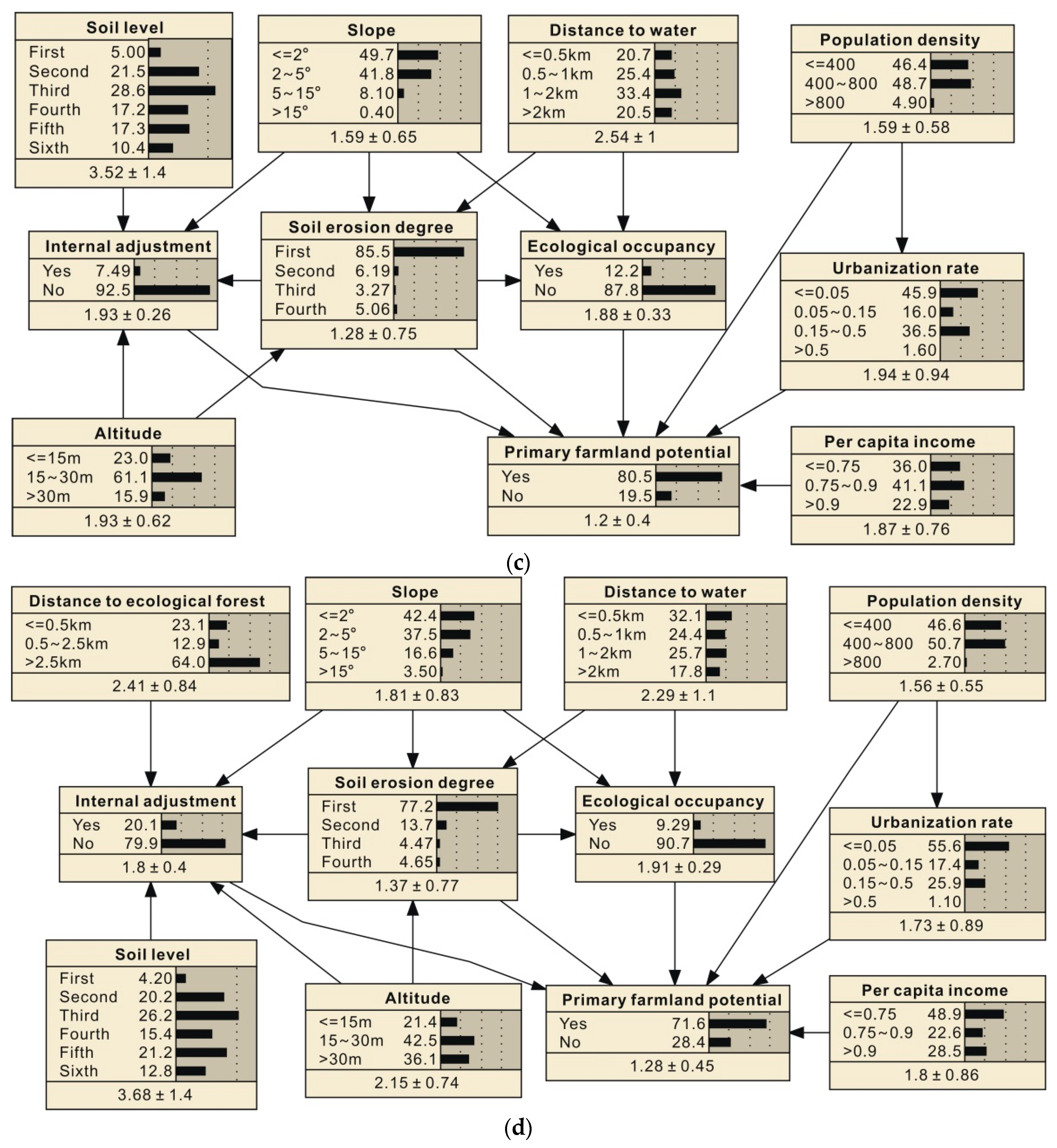 The final network structure of each model is illustrated in Figure 4. The target variable “primary farmland potential” indicates whether the farmland parcel is fit for primary farmland protection. For three historical change variables, urban encroachment is affected by four locational variables; internal adjustment is determined by most of the biophysical factors, except distance to water; and ecological occupancy is influenced by slope, soil erosion degree and distance to water. The economic variables are related to “distance to city center” to reflect the impact of a city in terms of social and economic development.