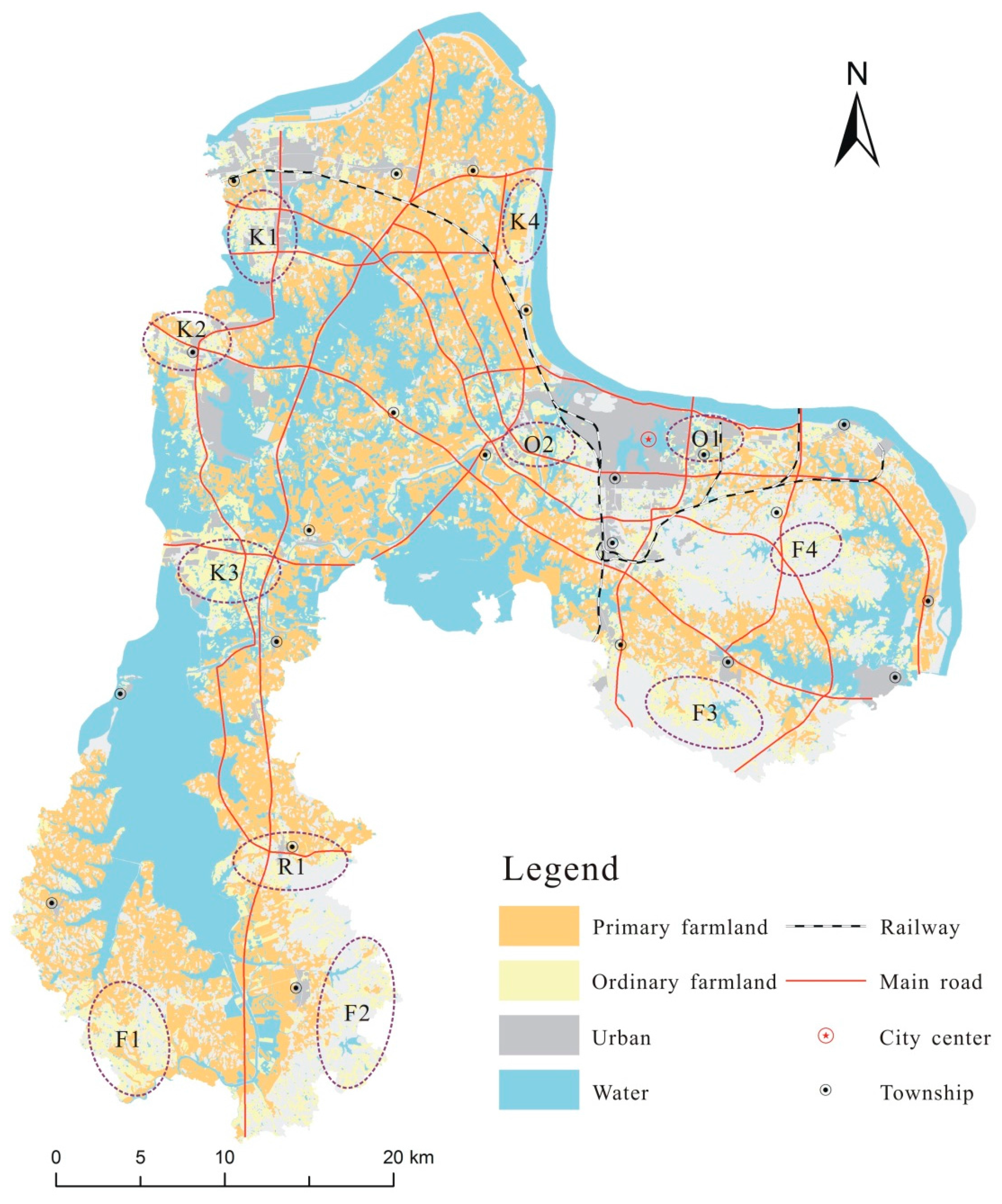 Moreover, the incorporation of historical change data revealed the farmland dynamic of different zones and exploring the impact of economic and suitability factors. This is helpful for ensuring that the zoning results correspond to the regional land use change trend, improving the stability of primary farmland and promoting the coordination between urban development, ecological restoration and farmland protection (Figure 6). For example, the primary farmland of ODZ and KDZ abandoned the farmland parcels adjacent to present urban construction land (O1~O2, K1~K4) to leave room for urbanization. Instead, farmland of high quality and relatively lower development potential is included in the primary farmland (O3~O5, K5~K7) to ensure that the quantity of the farmland protection is reached, as well as improving the overall quality of primary farmland. Moreover, some of the farmland parcels at FDZ are also unsuitable for farmland protection, due to their poor terrain conditions, lower productivity potential or close proximity to ecological forest. These are also key areas for the ecological reforestation of E-Zhou city, filled with land reclamation and reforestation.