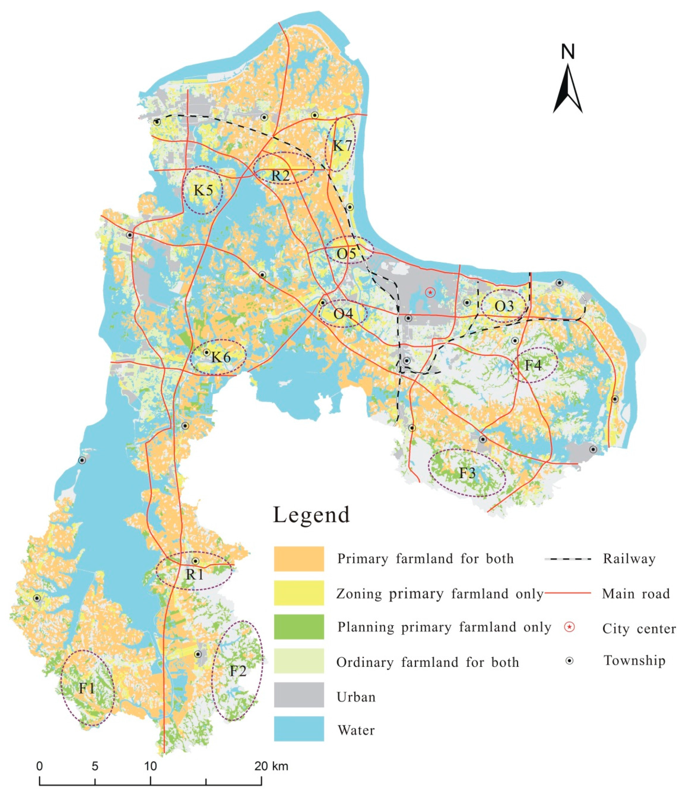 The scenario simulation result of zoning primary farmland is shown as Figure 6. Some of the farmland parcels were abandoned in the process of zoning primary farmland, as their potential values of primary farmland were low. We selected 11 typical areas of ordinary farmland from four development priority zones to analyze the main reasons for their low primary farmland potential. The utilization grade of most farmland parcels in the R1 area is fourth or fifth, which suggests low grain productivity potential. Farmland in the sites of F1~F4 has serious soil erosion and a high slope, making them difficult to cultivate. In contrast, the natural conditions of farmland in the sites of K1~K4 are relatively fine. However, they are still abandoned as they are located adjacent to urban construction land and traffic lines, easily encroached by urban expansion. The farmland parcels in O1 and O2 are also not suitable as primary farmland because they are too close to the city center.