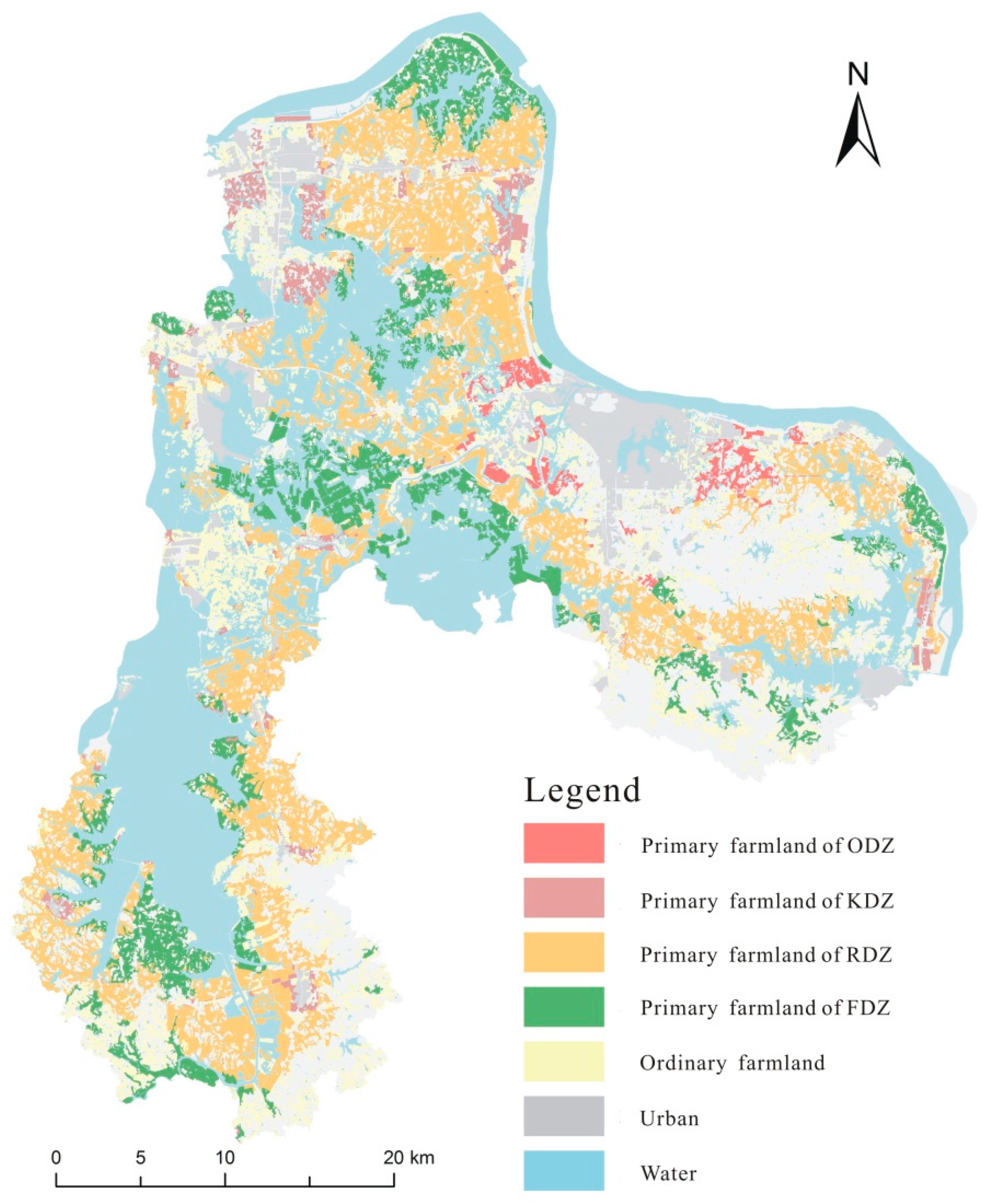 Optimization of the spatial allocation of primary farmland needs to combine the primary farmland potential (including quality and stability of farmland) with the spatial pattern. Firstly, we selected the farmland parcels of all of the zones with larger potential values into initial primary farmland, ensuring that the total area is slightly greater than the quota (the quota has been assigned by upper level government). Then, we dissolved the adjacent farmland parcels into one patch. Farmland parcels within the larger patch are considered to have better connectivity. Finally, we iteratively selected the farmland patches with a larger area as the final protected farmland, until the total area is equal to the designed quota of primary farmland protection.