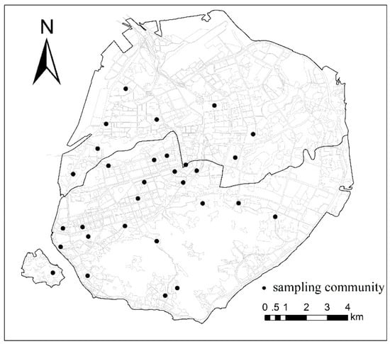 China’s rapid urbanization process has resulted in diverse urban communities. A multi-object spatial sampling method was introduced to obtain representative communities. The theoretical basis for spatial sampling is to determine the optimal relationship between estimation error, sampling density, and spatial arrangement of samples, in the spatial context for objects that are distributed continuously or discretely in space, through direct or indirect estimating approaches [43]. This method has been used for sampling and statistical inference in environment, resources, land, ecological, social, and economic sciences. This study considered population density, landforms, and benchmark land price. If a specific zone is diverse and complex in land price, population density, and landforms, the variance is large, and there would be more sampling communities. As a result, the self-selection problem can be avoided, making the observed results more convincing. This method was chosen for its higher precision, given the budget limitations of the survey [44,45]. The sampling was implemented using a professional spatial sampling and statistical inference tool [46]. Some 30 sample communities were eventually selected, and 1090 households were randomly selected from these communities, of which, 1075 of these households granted us permission to conduct a face-to-face survey (Figure 2). Xiamen was categorized into peri-urban, ex-urban, and urban core areas, according to the extent of urbanization. The respondents accounted for 0.9% of the total households in the core area of the city. The survey was conducted by research staff in October 2012. The questionnaire was implemented on a household basis and included household demographic information, such as family income.