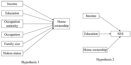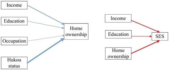A variety of factors, summarized as household characteristics, economic factors, and institutional factors, contribute to home ownership. Based on previous research and the housing reform background of China, we hypothesized that household characteristics (family size and education), economic factors (income), and institutional factors (hukou and occupation) influenced homeownership together (Hypothesis 1). An index of a self-rated socio-economic status (SES) was used to identify social stratification. Previous studies identified income and education as the most important factors influencing SES [40,41]. Considering the situation in China, we also hypothesized that home ownership inequality has led to self-rated SES differentiation in post-reform China (Hypothesis 2). We explored these two hypotheses by establishing a structural equation model. In this article, we also use logistic regression to specifically address the following questions: (1) How have demography and institutional transition influenced home ownership in the post-reform period? (2) How and to what extent does home ownership inequality vary across socio-economic classes?
